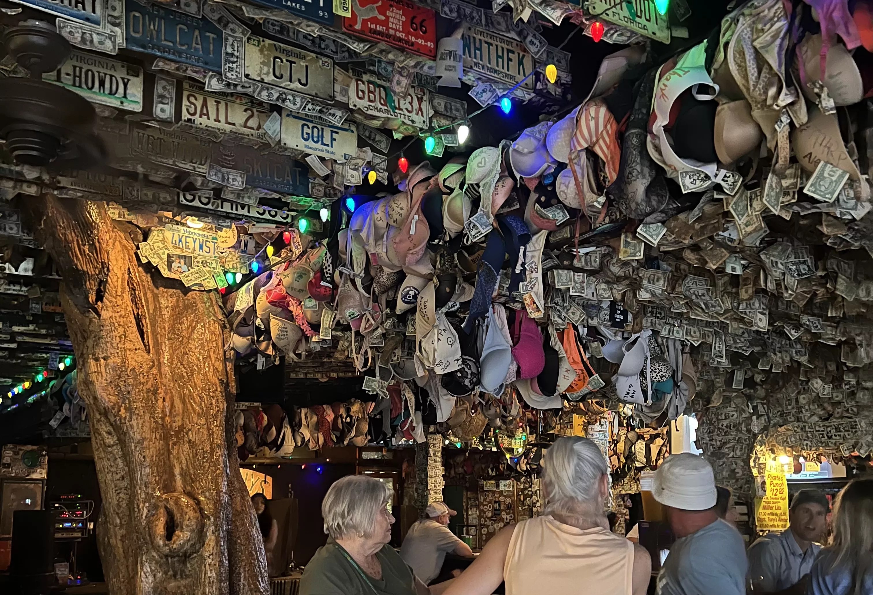 Inside Capt. Tony’s Saloon, bras and dollar bills hang from the ceiling beside the trunk of a tree.
