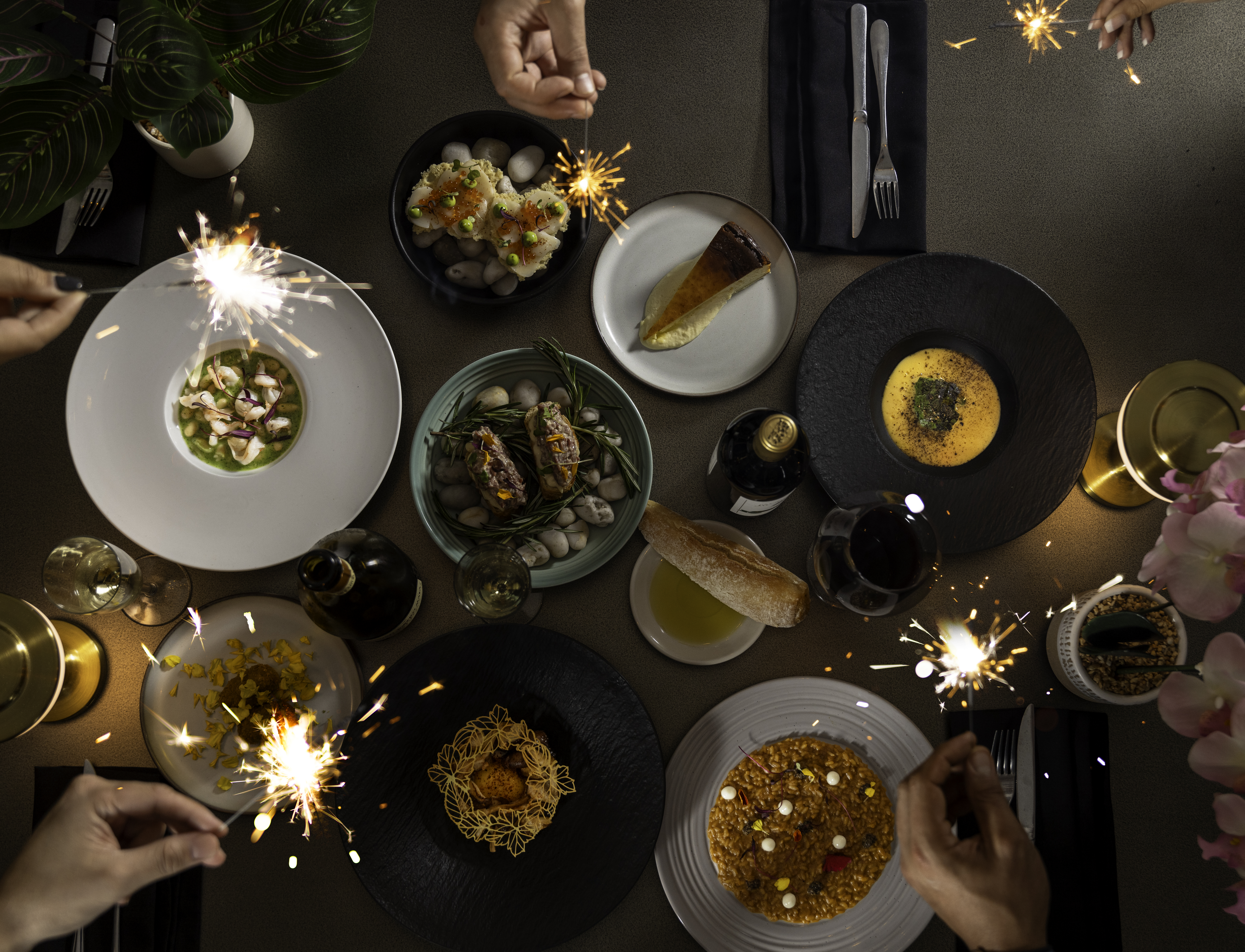 Aguasal’s NYE Gala Dinner runs from 7 p.m. to midnight with a four-course menu featuring a Kumamoto oyster amuse with caviar and cava espuma, Maine lobster confit with ensaladilla rusa and saffron aioli, and an artichoke “paella” with heirloom toy box greens. Entrées include Wagyu beef tenderloin with celery root and black truffle purée, served with sherry jus, or turbot accompanied by winter vegetables and Pedro Ximenez hollandaise. Dessert is a complete Viennese table featuring crème catalana, tarta de Santiago, fruit tart, Valrhona fondant, and profiteroles. À la carte dinner is served from 5 to 7 p.m. 1535 Collins Ave., Miami Beach; andazmiamibeach.com.