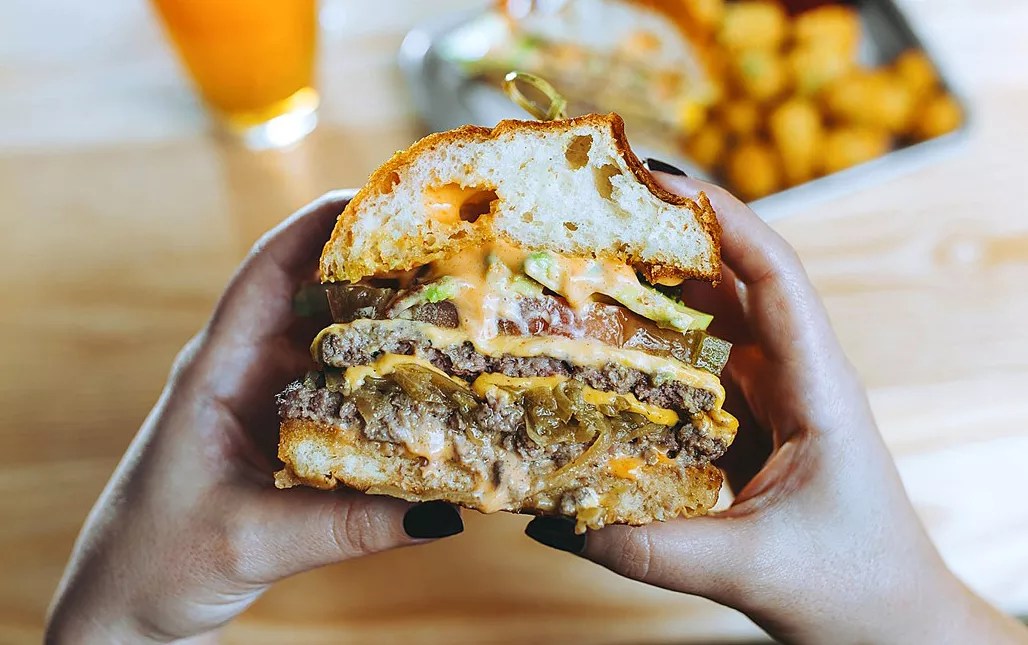 Order the burger ($17) at this Japanese-anime-themed noodle spot hidden away in the basement of the Townhouse Hotel, and the only thing to decide is whether you want French fries or tater tots. Just let the kitchen do the rest. This beast of a burger is bookended by slices of sturdy yet tender brioche bun that’s as soft as a Martin’s potato roll but won’t mush up or let you down. It’s a double-patty affair, and each one of the pair is round, has a slightly pink center, and boasts a woody char. There’s also some sweetness courtesy of caramelized onions and a hit of acidity from a thick slice of tomato. A blend of American cheese mingles sensually with a house spicy sauce that cascades over each bite. If some is left on your chin, so be it. Such is the price of entry to burger heaven.