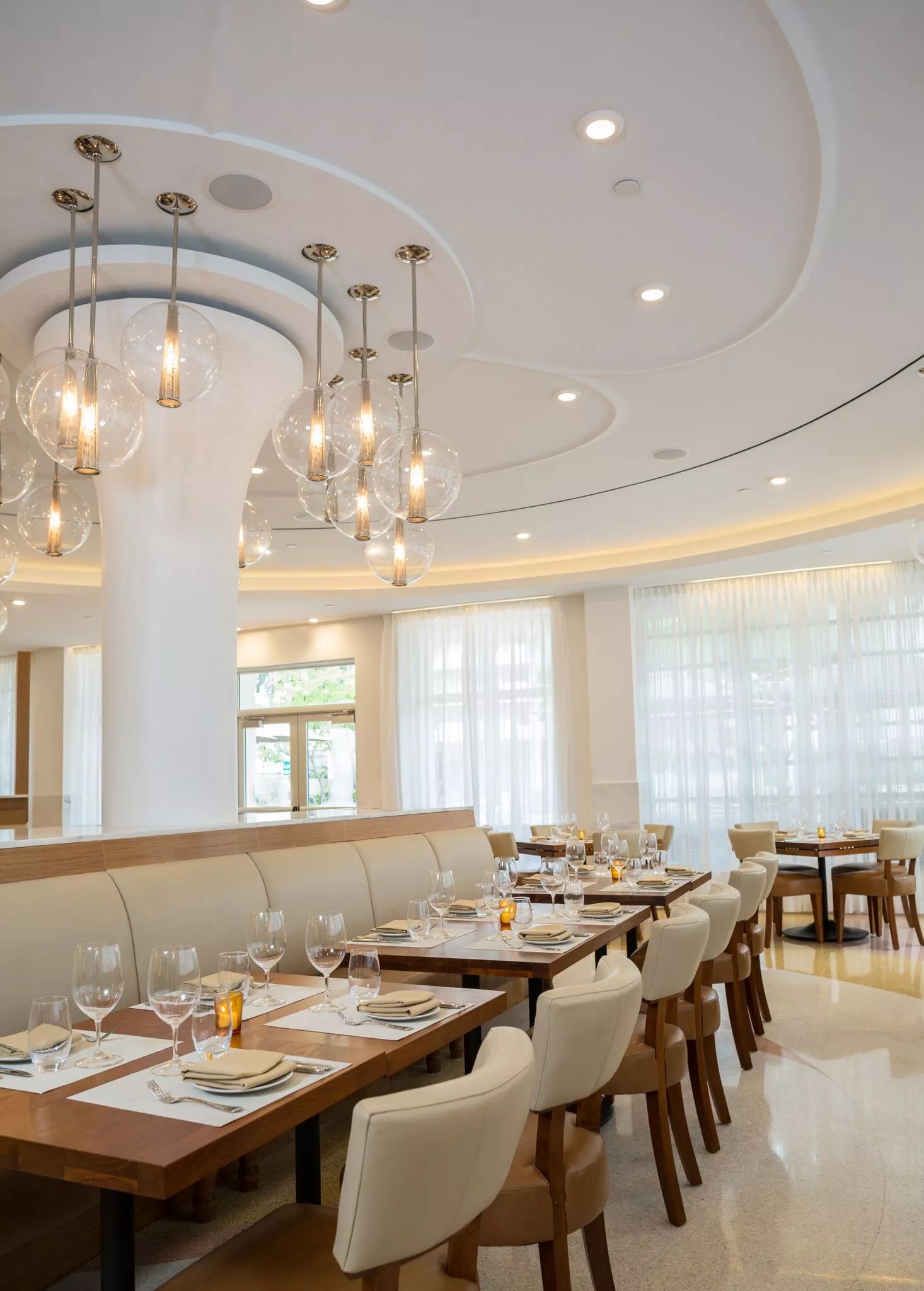 BLT Steak, located right off the lobby of the Iberostar Berkeley Hotel, seats more than 150 guests, both inside a sleek white dining room and on a lushly landscaped patio. The space also has an intimate backyard with communal seating for larger parties.