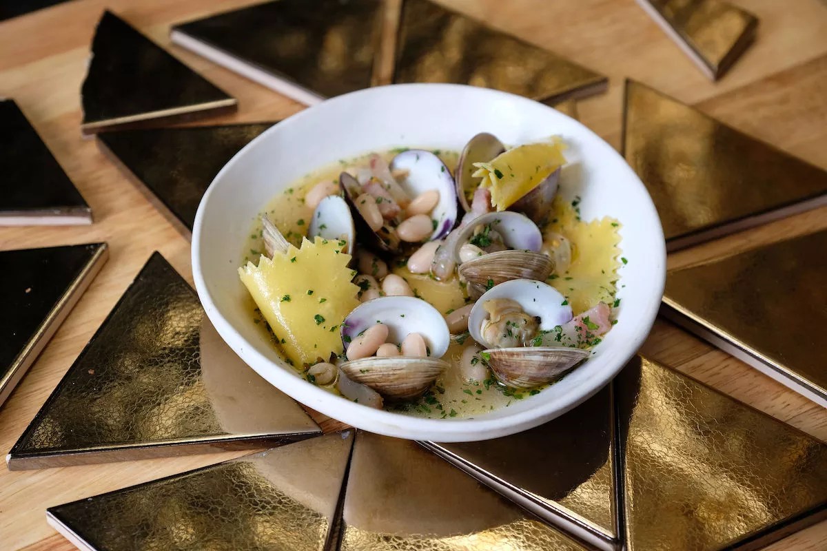 Other offerings appear less decadent, but don’t be fooled. Pillowy ricotta gnocchi ($17) are enveloped in a tangy fresh tomato sauce that achieves incredible complexity with little more than chilies, basil, hot pasta water, and a pat of butter. It is not to be missed. Neither is the pappardelle alla lepre ($22), with unctuous shreds of braised rabbit tangled amid wide ribbons of pasta; nor the pasta squares and cannellini beans ($18) highlighted with salty middleneck clams scattered across the plate, all slicked with a pork cheek fat-infused Parmesan broth.