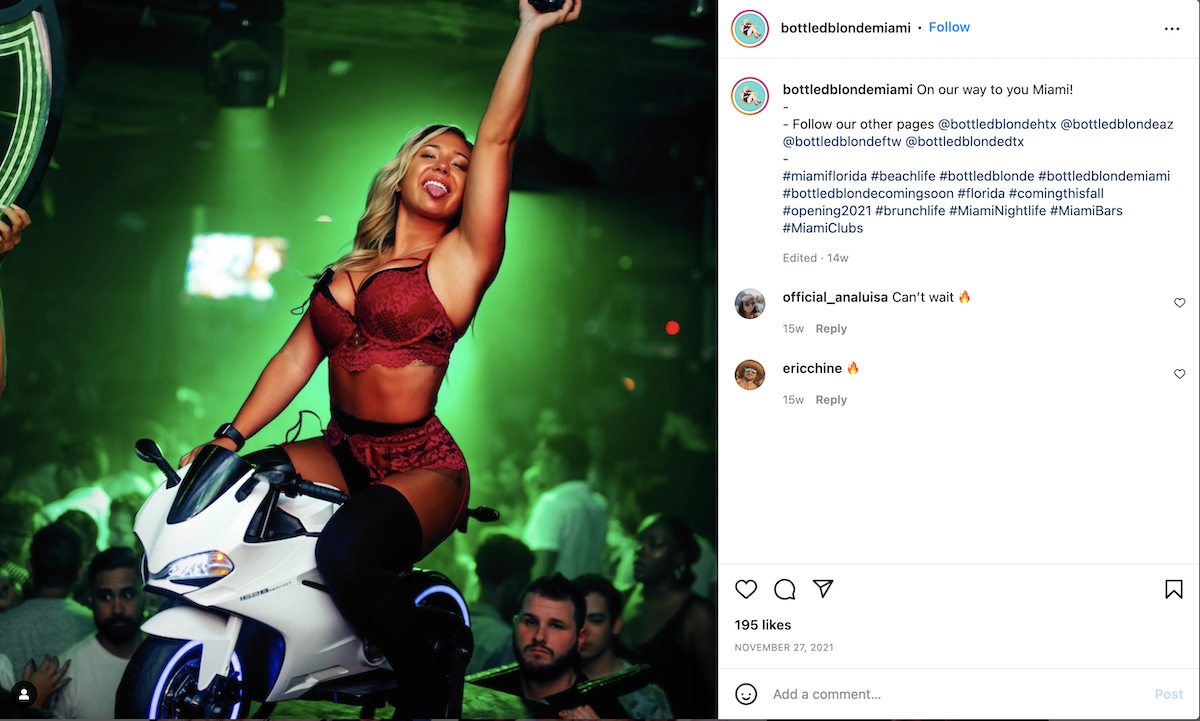 The Miami location’s Instagram account is already brimming with pics teasing, “Are you ready for the grand opening?!,” and displaying women in lingerie posing atop tiny bikes and other mini-conveyances, Veuve Clicquot in hand. The unique service was initially pointed out on Twitter on Friday by former New Times music editor Arielle Castillo, who posted a screenshot from a video of a bottle girl on a small bike.