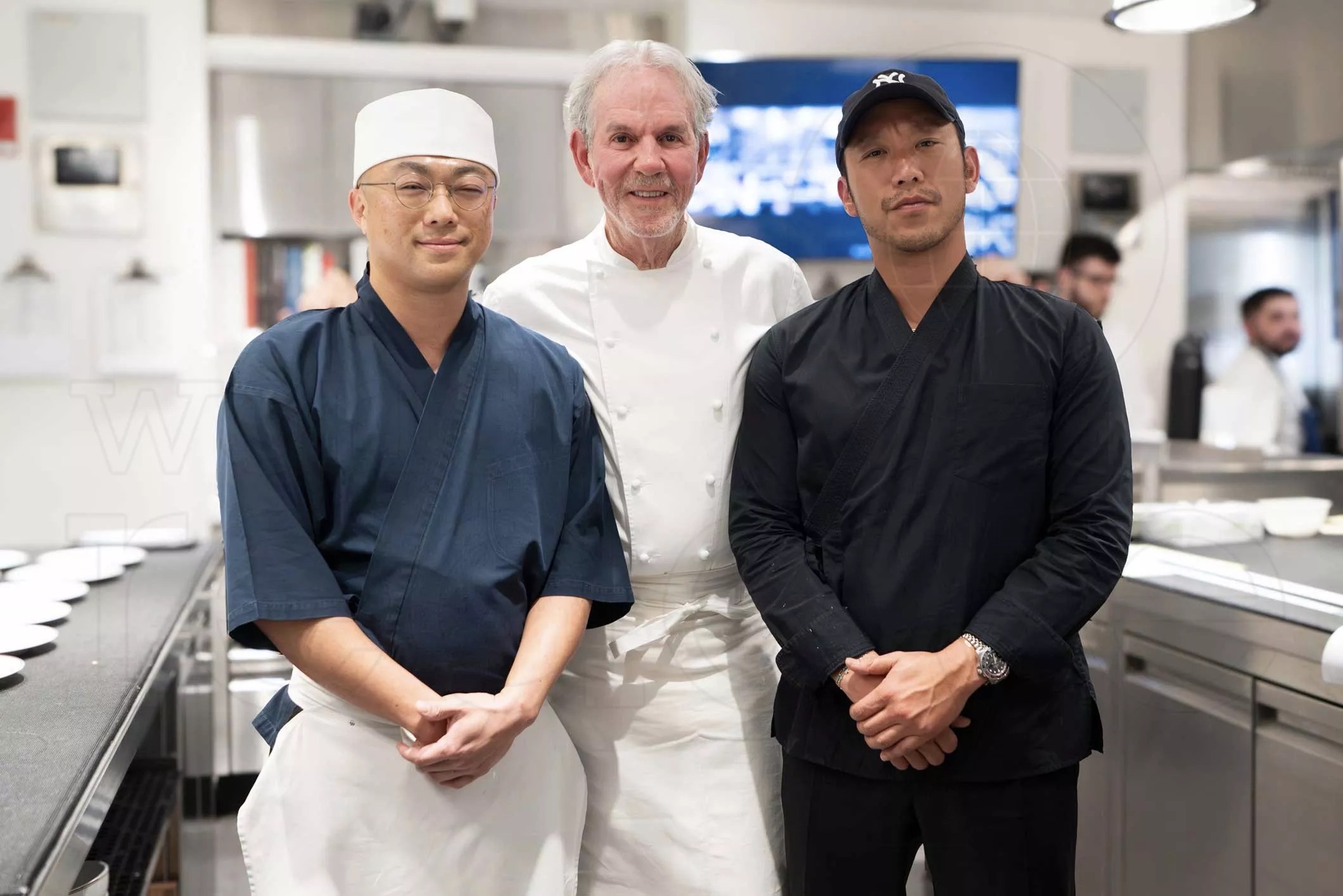 From left: Shingo Akikuni, Thomas Keller, and Simon Kim at the unveiling of the Garden at Bouchon on March 13.
