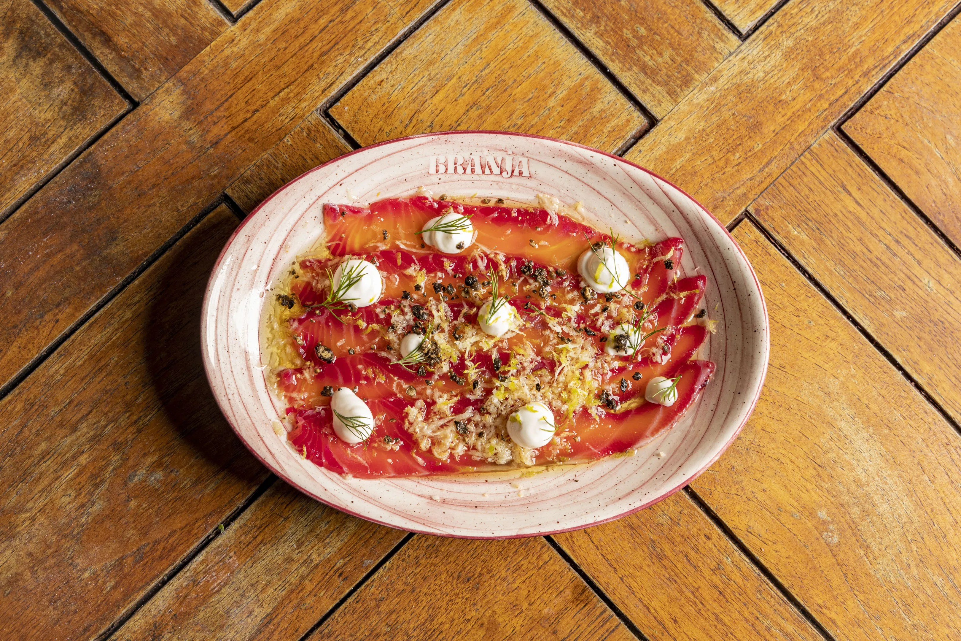 Branja’s “Brooklyn Heights sashimi” is beet-cured salmon that looks simultaneously like lox, tiradito, and pastrami.