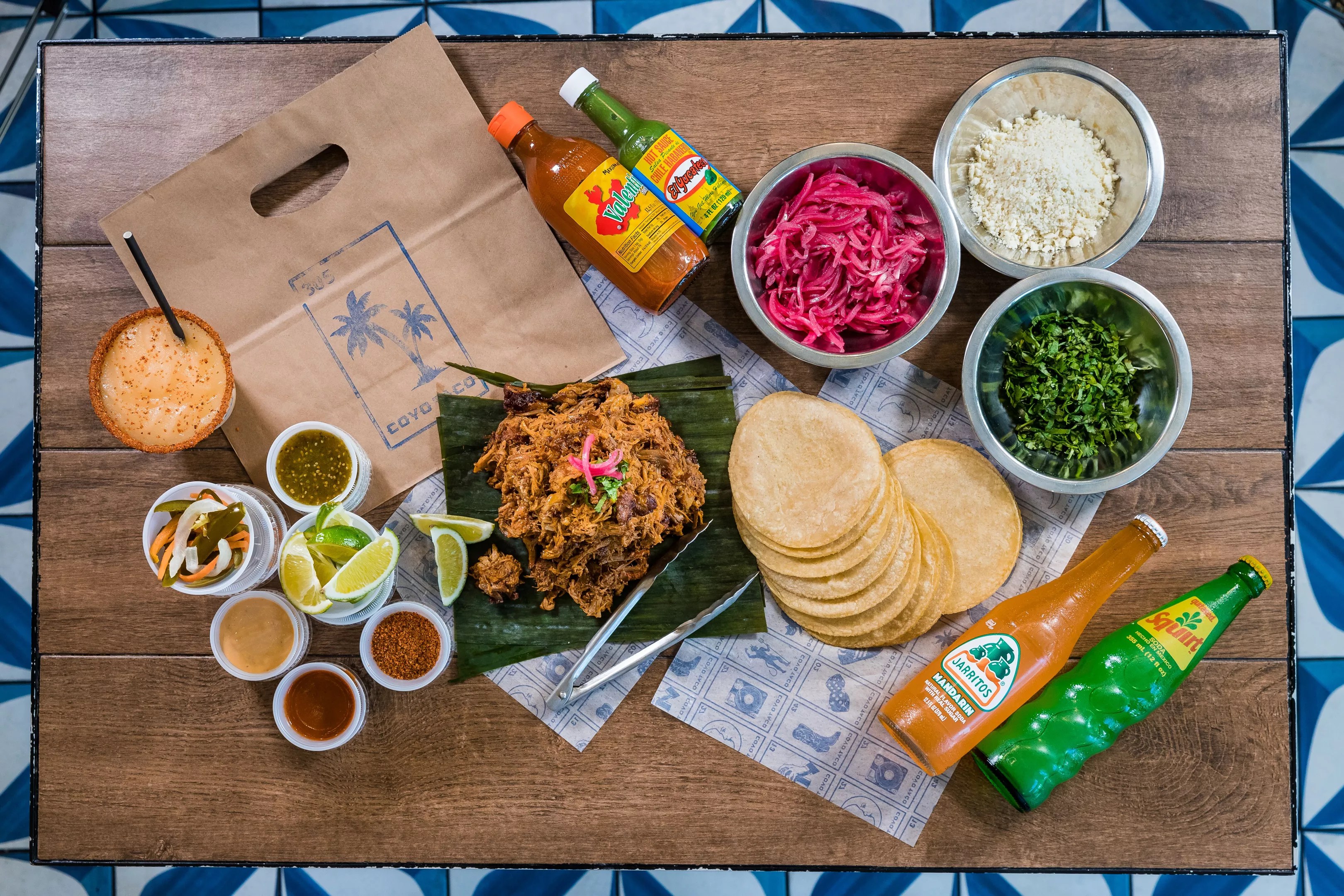Find a six-taco box at this Southern American eatery in South Miami. The options: fried chicken, pork belly, and ranch pickled relish; royal red shrimp with pickled onions; or barbecue ribs with tangy sauce and coleslaw ($40). Each box comes with sides of mesquite barbecue slaw, southern elote with farmer’s cheese, pickled fresno chili and spring onion, and one bottle of On the Rocks Premium Margaritas. Guac and chips are available for $10, mini churros for $5.