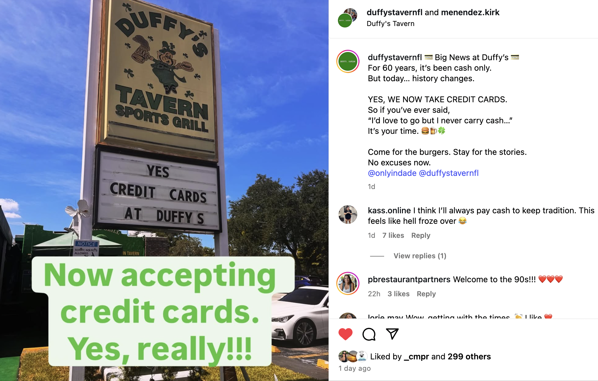 A photo shows the tavern’s marquee sign, located along Red Road just west of Coral Gables, updated with the message: “Yes, credit cards at Duffy’s!”