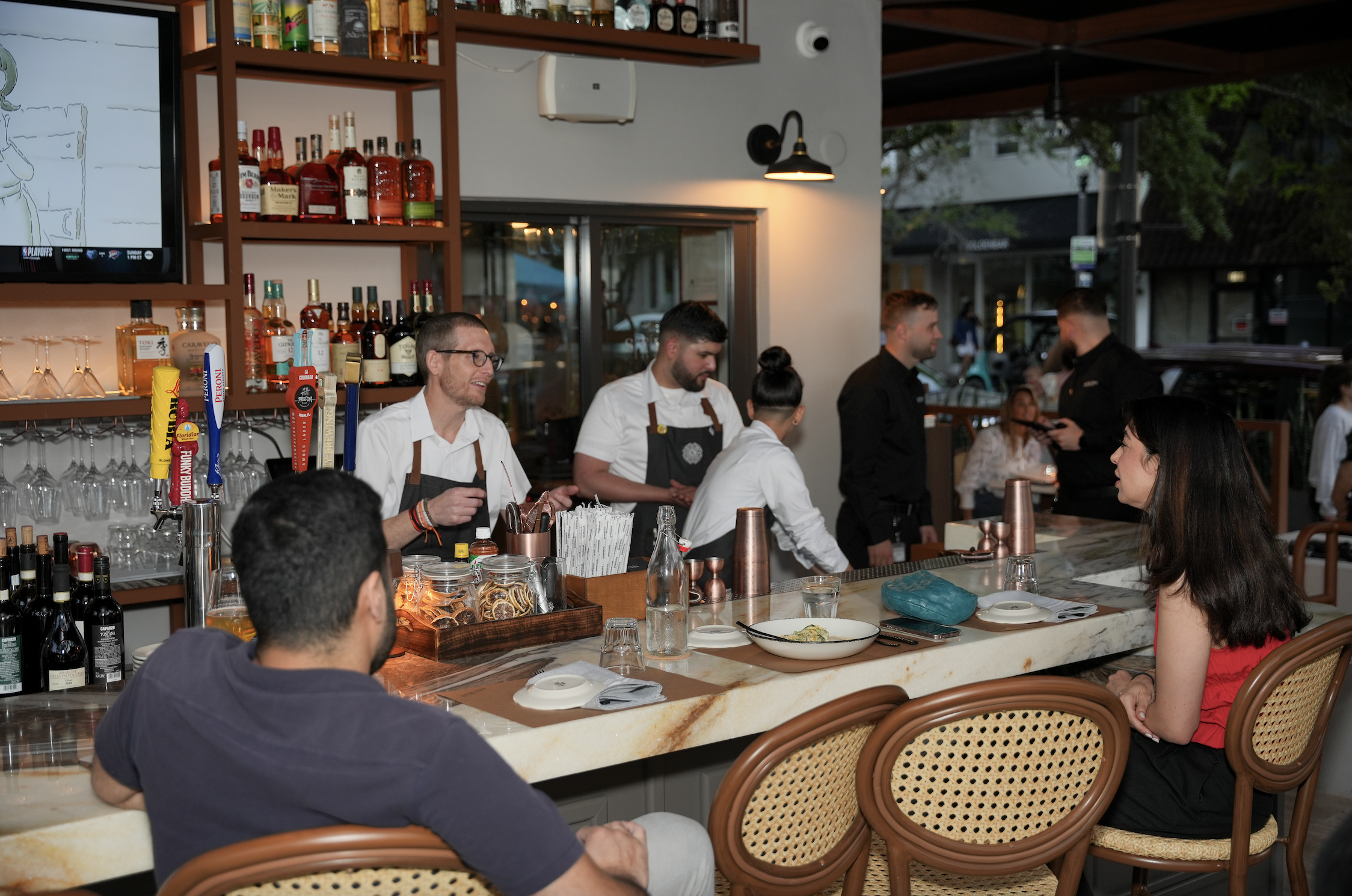The bar moved from the right side to the left, creating a wraparound indoor-outdoor space that’s quickly becoming the spot’s signature feature. The cocktail menu doesn’t skimp, featuring Italian-inspired drinks like the Negroni Congelato, a frozen spin on the classic with Bombay gin, Martini & Rossi vermouth, and 1872 Reserva bitters. For something lighter, the Limoncello Spritz combines Pallini limoncello, prosecco, and homemade basil syrup.