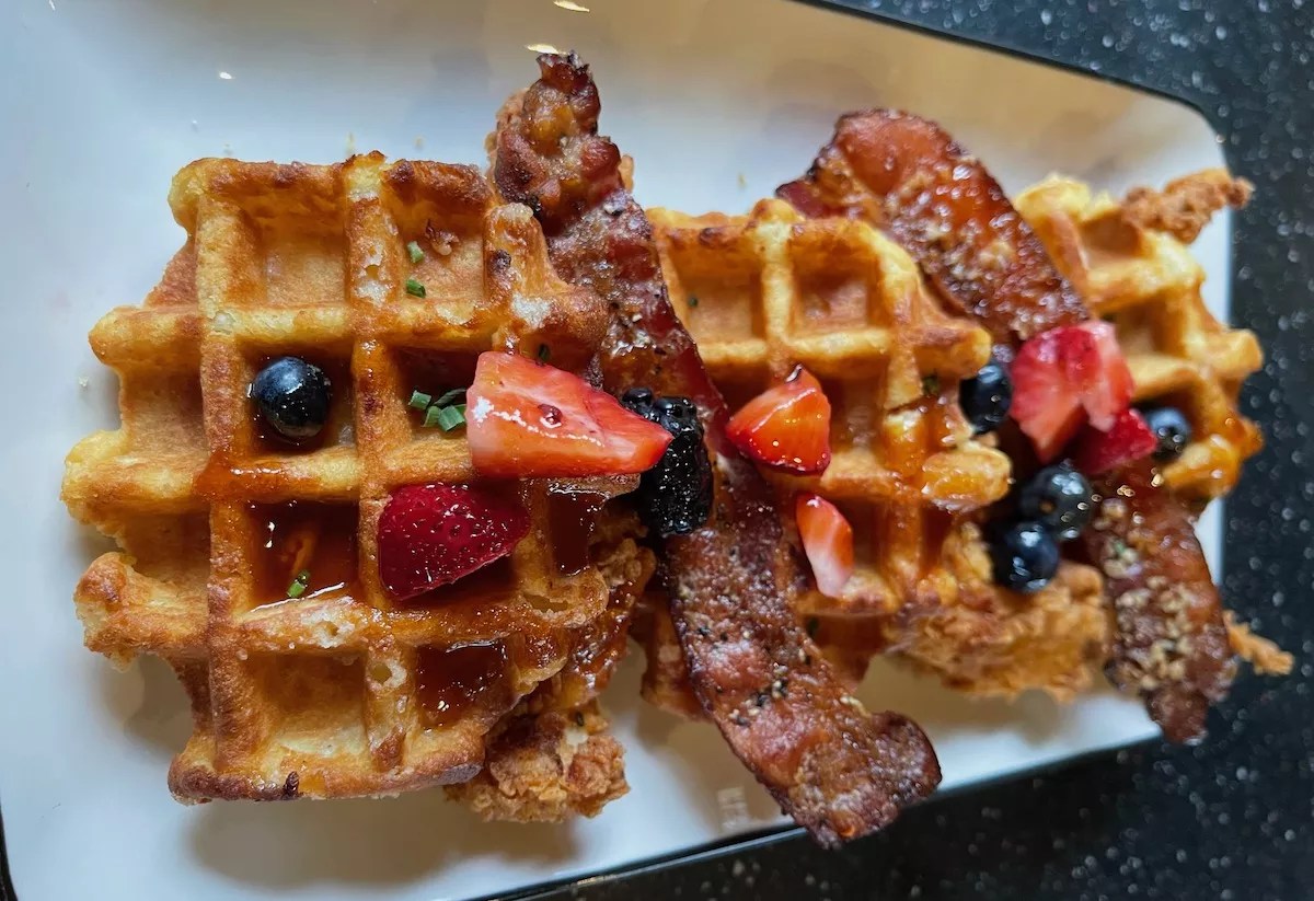 Now, diners can find Crackers’ most popular breakfast items available from open to close under the “Brunch All Day” section of the menu. That includes the previously special-only chicken and waffles ($18), breaded and fried chicken tenders topped with candied bacon and slathered in hot honey.