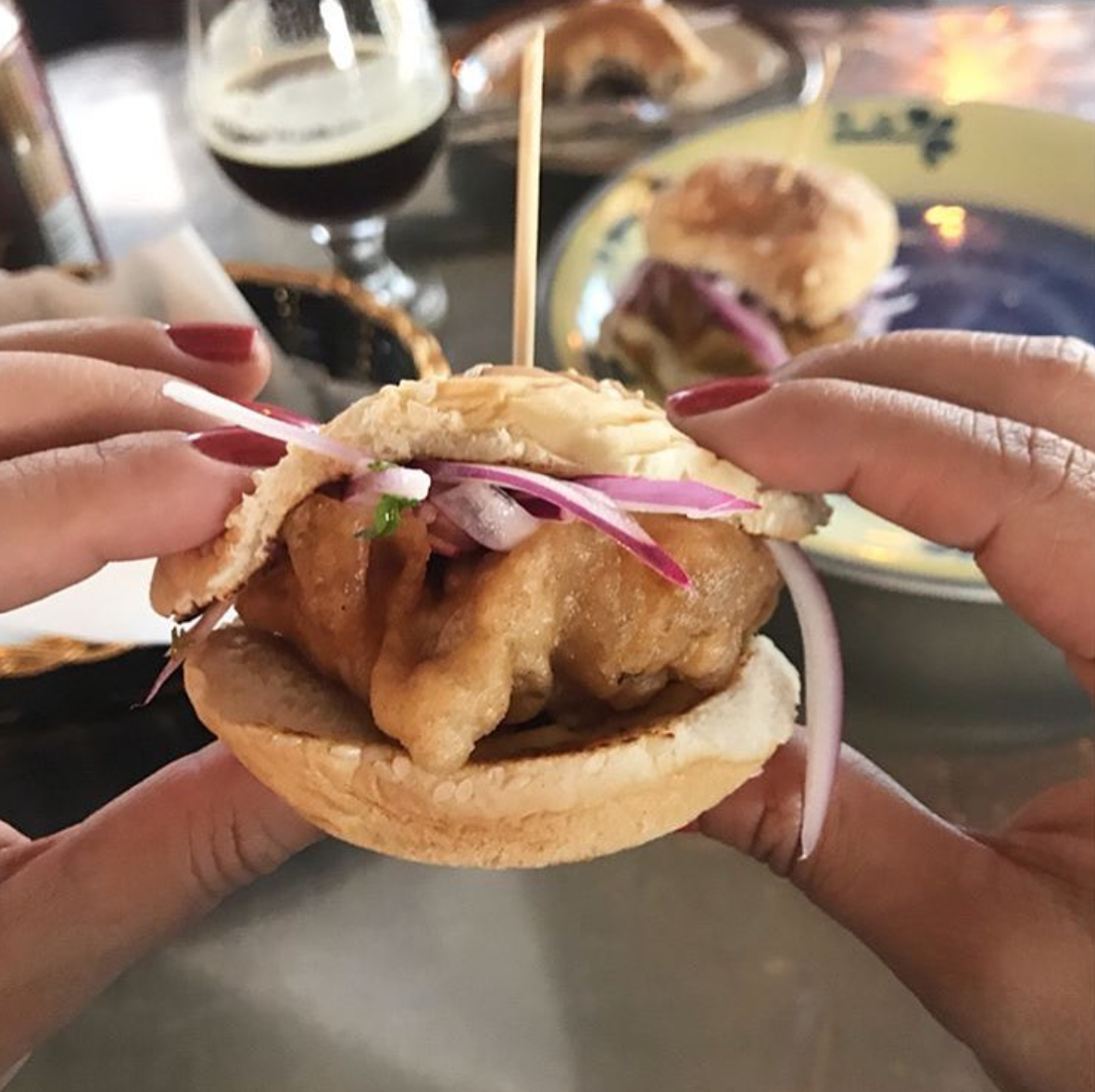 To the left, find arepitas, where mini cheese arepas are garnished with a chicken salad containing almonds and avocados; and tequeños, Venezuelan-style cheese sticks served with a cilantro aioli dipping sauce. For something lighter, there’s a smoked greens plate, which stuffs zucchini with seasonal vegetables, herbs, and cheese. Alligator sliders are among the more adventurous plates at Edukos. Courtesy of Edukos
