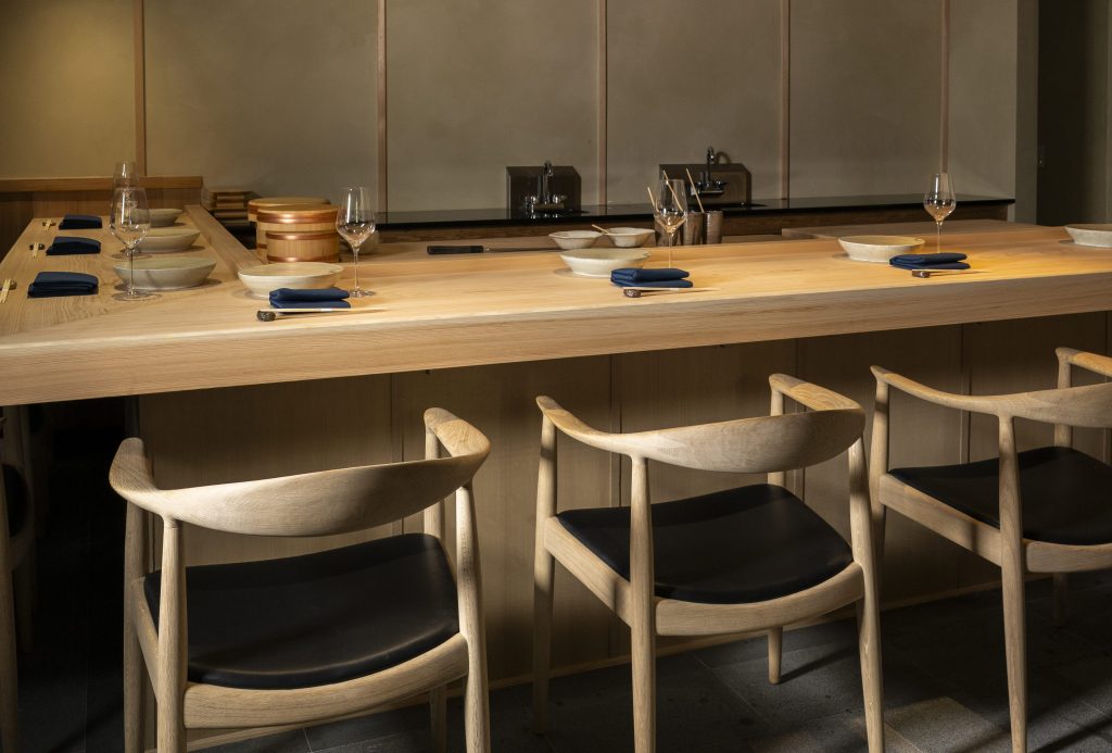 The centerpiece is a 600-year-old hinoki counter sourced from Kii-Nagashima in Mie Prefecture, Japan. This grade of timber is usually reserved for temples and shrines and not sold publicly. The staff polishes it daily with rice bran instead of sealing it to preserve its natural texture.
