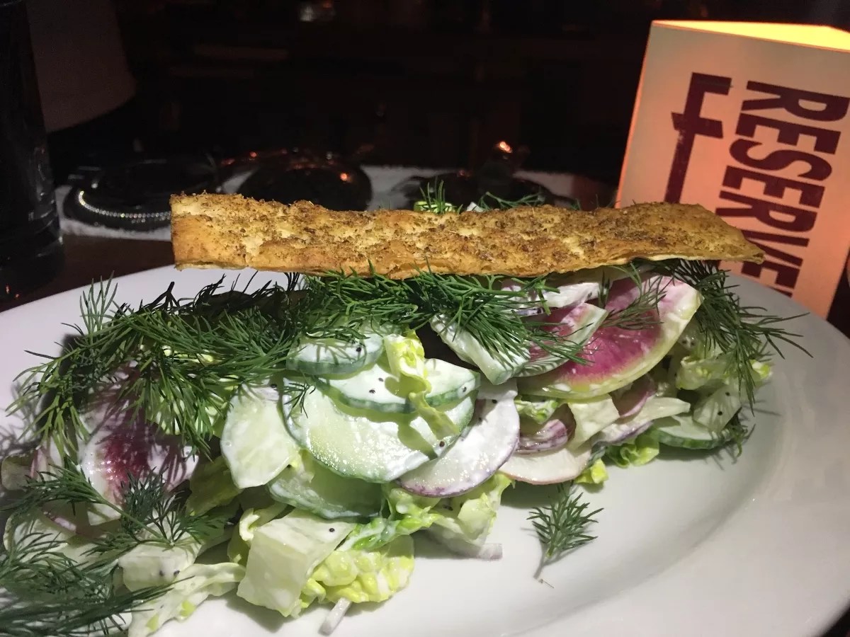 A cucumber and radish salad, served with caraway flatbread, is tossed with yogurt and garnished with fresh dill, giving this plate brightness and color ($13). Photo by Laine Doss