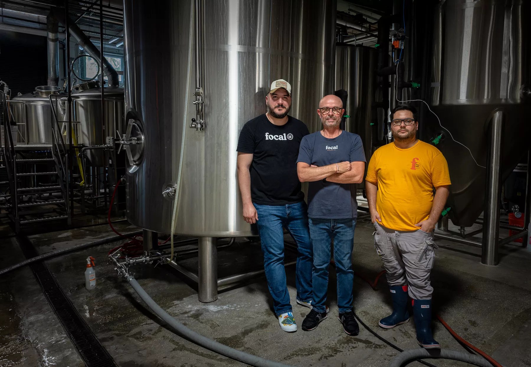 Focal Beer Cafe general manager Leo Diaz (left), Humberto Perez, and head brewer Carlos de la Rosa (right) stand inside the Focal Beer Cafe brewhouse which took over Bousa Brewing Co. in July 2019. .