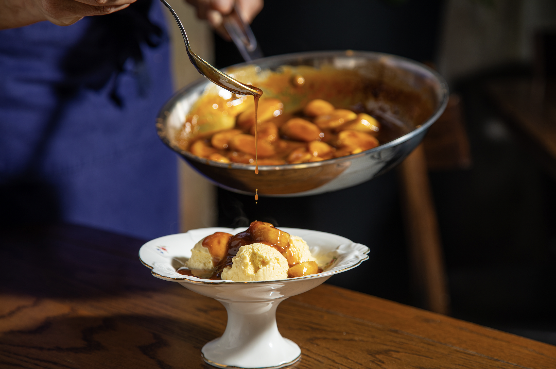 A bananas Foster dessert is poured over vanilla ice cream by chef Nina Compton.
