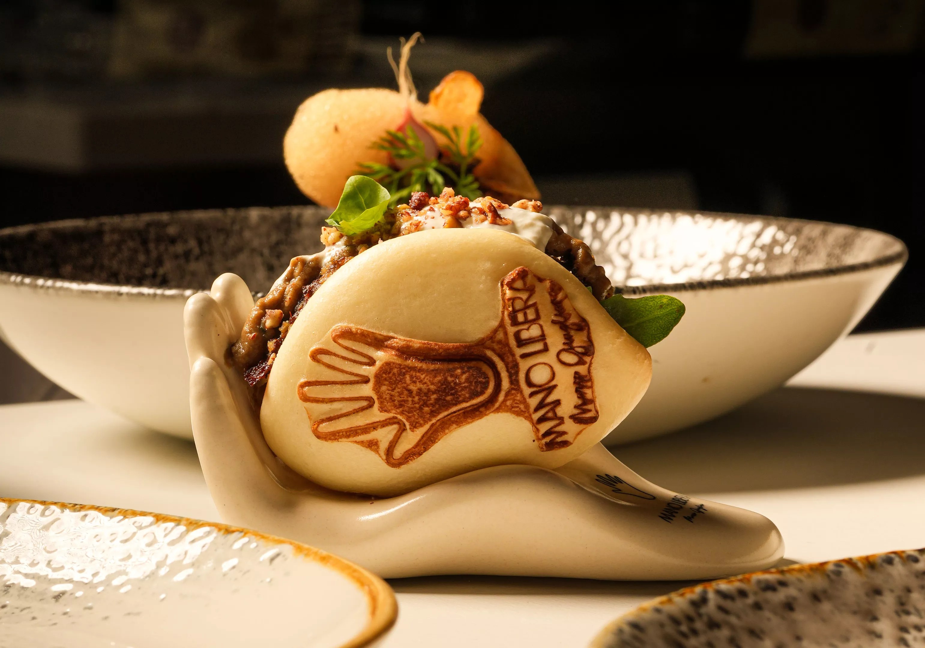 Other menu highlights include a vegetarian bao stuffed with eggplant, fior di latte mozzarella mousse, and walnut crumble served on a small plate shaped like a hand. Red shrimp carpaccio is paired with buffalo stracciatella and crisp potato chips, and a housemade pistachio gelato served in a playful plate shaped like bright red lips.