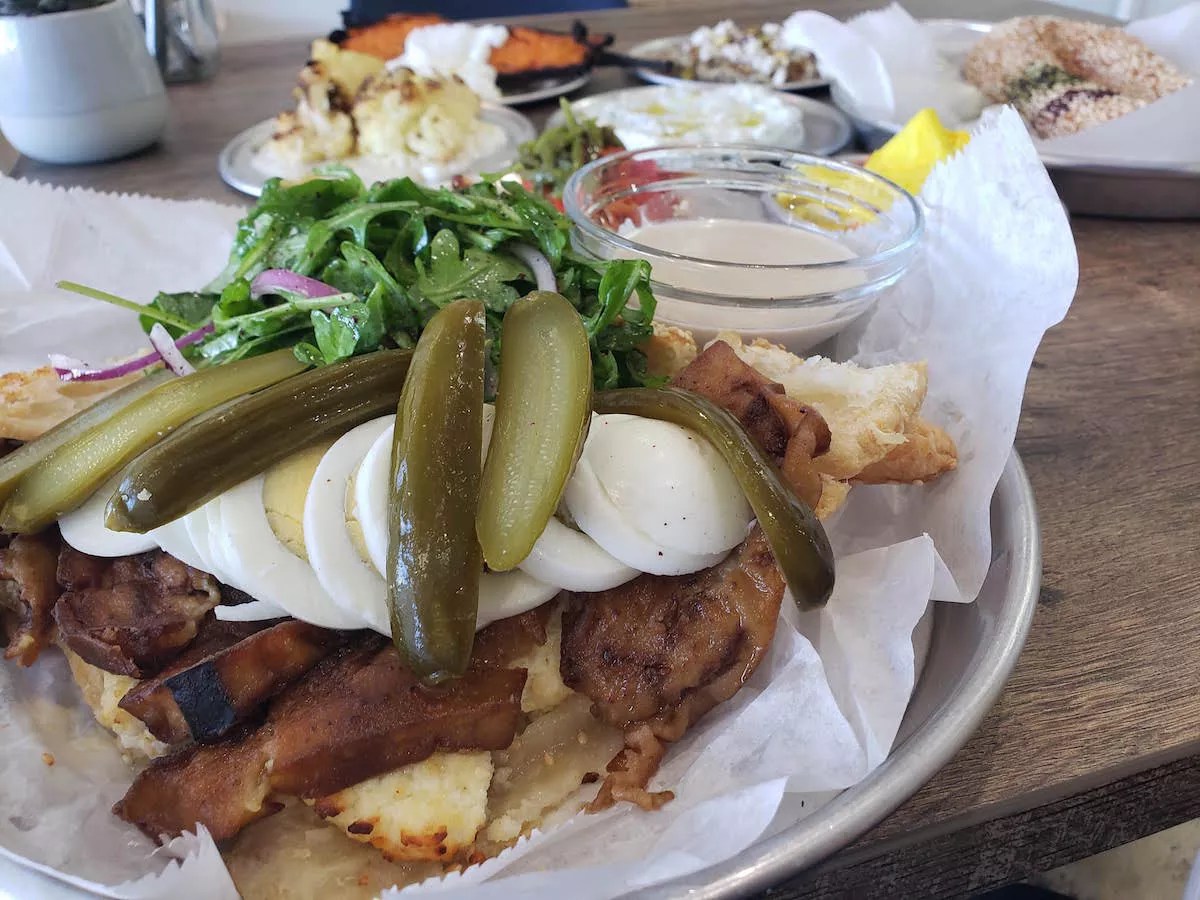 Locally, some of that technicolor diversity is available at Assaf and Tal’s café, Hadekel 1, for which they partnered with Asaf Ely, who worked for the iconic Israeli chef Meir Adoni, and named for the address where they lived in Ariel. It’s especially best at their recently launched brunch, which for a mere $30 brings a crusty, puffy Jerusalem bagel sprinkled with za’atar alongside a changing lineup of five to six tapas and a shot of the anise-flavored Lebanese liqueur arak.
