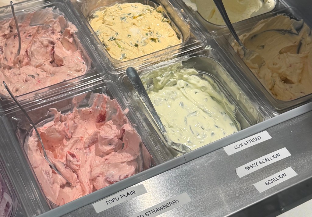The luscious cream cheeses come in flavors like strawberry, spicy scallion, and even a tofu variety for those seeking a dairy-free option