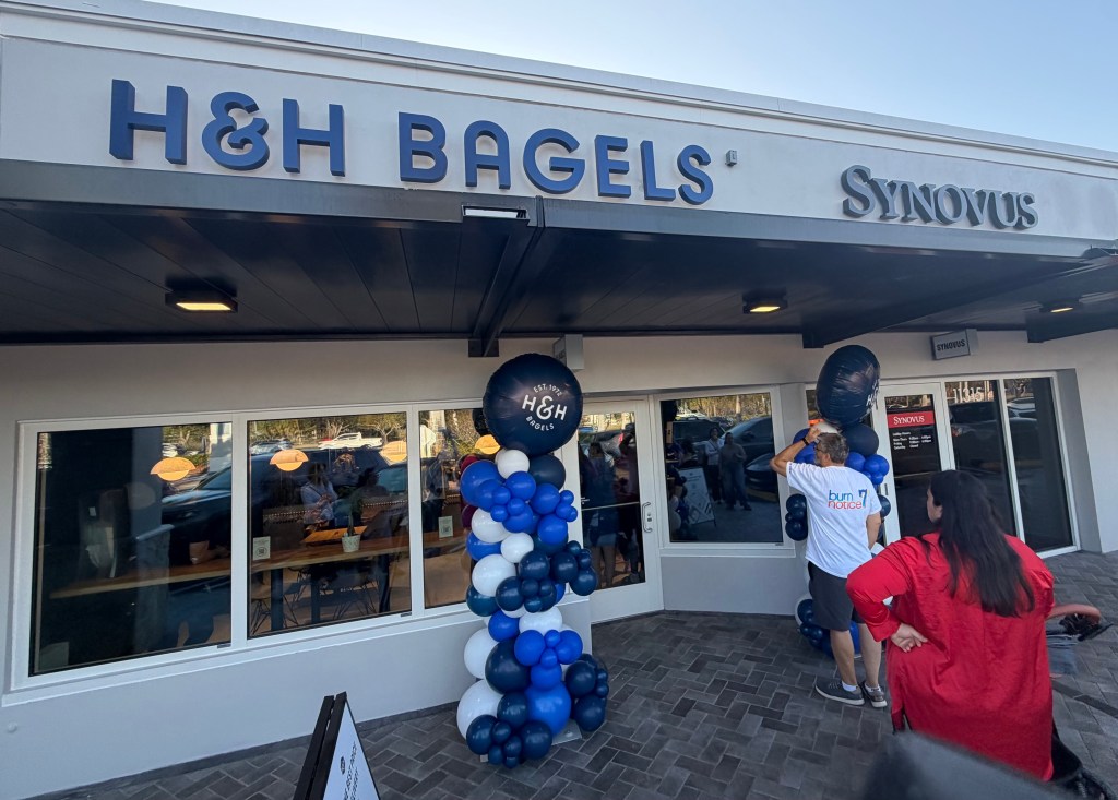 My alarm went off at 6 a.m. Thursday morning, and for once, waking up early felt justified. By the time I arrived at Suniland Shopping Center along U.S. 1 and Southwest 112th Street in Pinecrest around 7 a.m., a line had already formed outside the new H&H Bagels, stretching past the storefront and pouring onto the sidewalk. Blue and white balloons framed the entrance, gently bobbing above a crowd that waited patiently, quietly buzzing with anticipation.