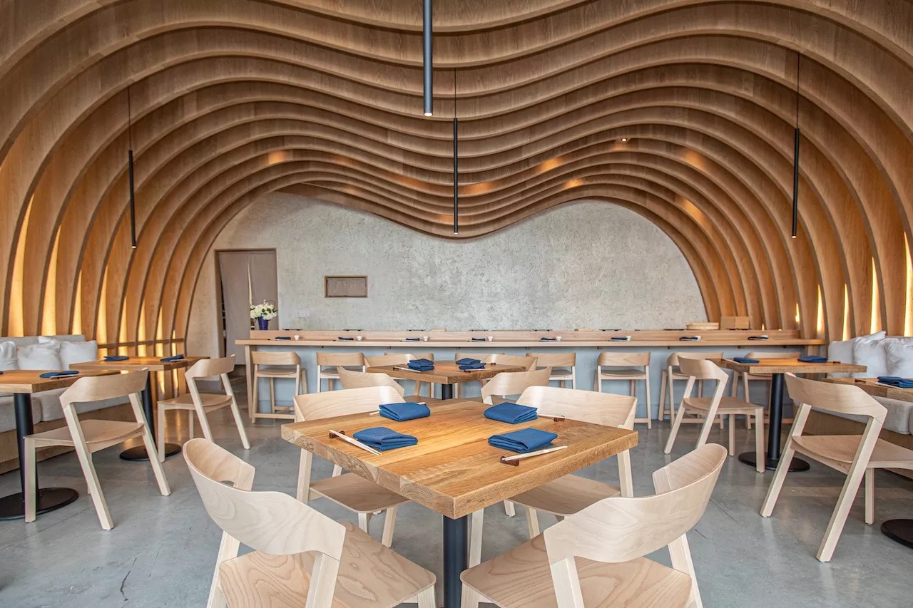 Perez Miranda tapped designer Bea Pernia to co-create a convivial, minimalistic eatery, which includes a small entry lounge furnished with blue-cushioned banquettes, natural oak paneling, wall art, and industrial-style concrete floors. The main dining room is distinguished by a series of curved wooden beams around and overhead reminiscent of a giant ribcage, that combined with backlighting, create an amphitheaterlike setting, with a sushi bar positioned as a stage for diners to view the chefs at work.