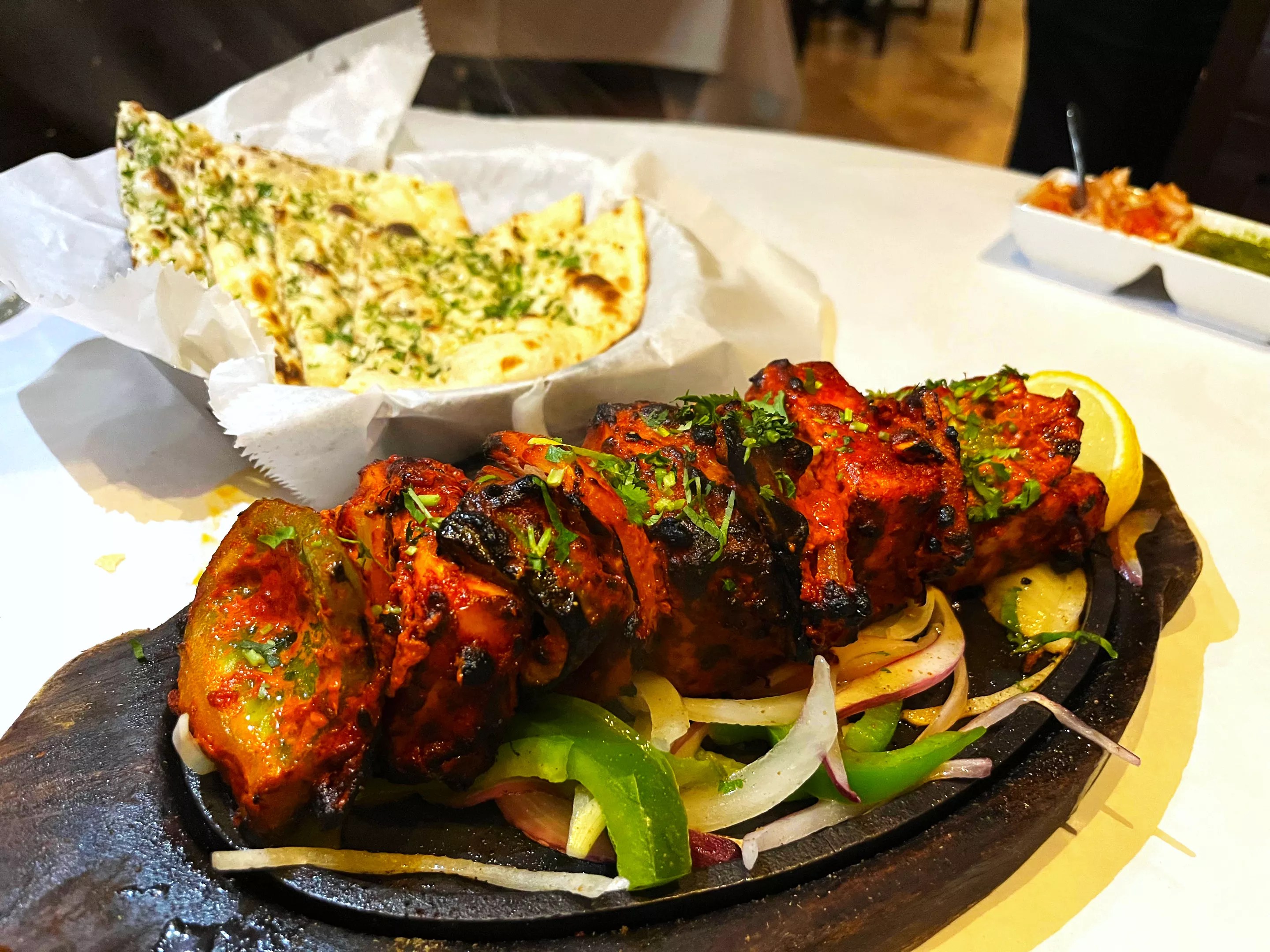 Meals here can begin only one way: with the housemade garlic naan. It arrives from the kitchen piping hot, thin, smokey flatbread topped with zesty cilantro that is best when used to ladle saucy dishes from plate to mouth.