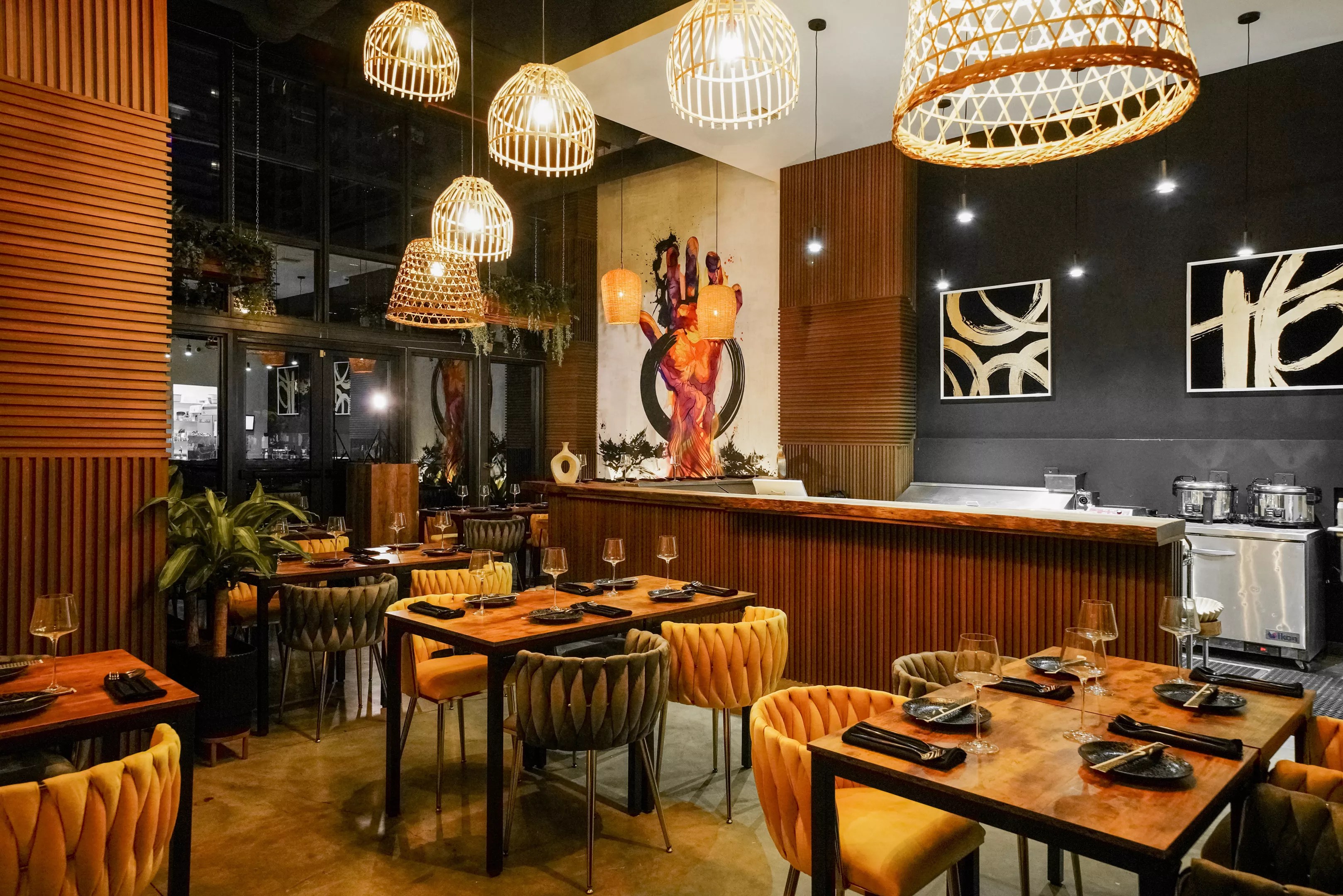 The dining area features a minimalist design with warm wood tones, velvet chairs, handmade lamps, an open kitchen, and a five-seat bar, providing an intimate setting for sushi lovers.