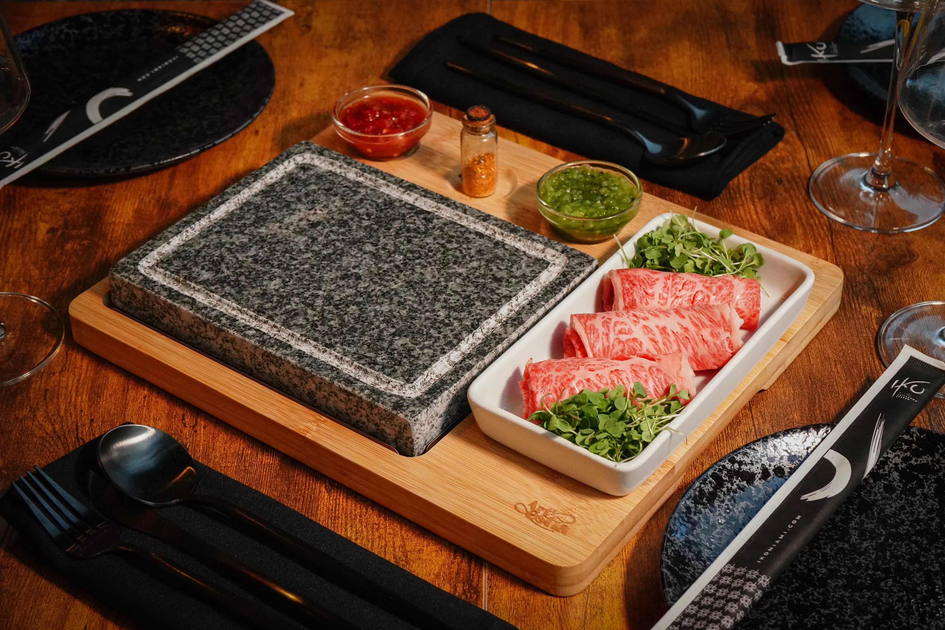 Iko’s signature dish is the “Wagyu Bar,” which allows diners to cook premium Wagyu selections on a hot stone directly at their table. Selections include a choice of seared A5 Wagyu ribeye served on a hoba leaf: the “Sukiyaki Truffle” is thinly sliced A5 Wagyu infused with truffle, the “Sukiyaki Classic” is thinly sliced A5 Wagyu prepared in traditional sukiyaki style, and the “Cube Box,” which is the finest Japanese Wagyu on the hot stone.