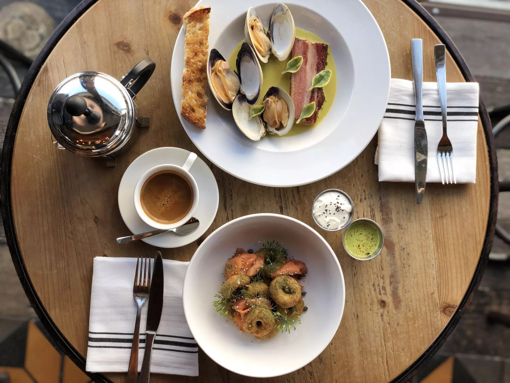 In true deli fashion, Mason offers sandwiches piled high with pastrami, beef, or ham ($16), as well as a selection of egg plates such as pastrami hash ($16) and the Goopy Egg, served with manchego, sour cream, and a bagel chip ($14).