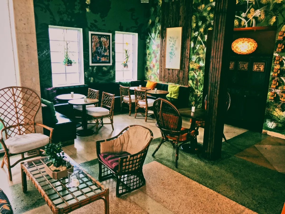 The bar, open Thursday through Saturday, boasts a midcentury-modern-goes-tropics vibe with vintage rattan seating and Chinese lucky cats gracing the walls alongside murals by Miami artist Miguel Paredes.