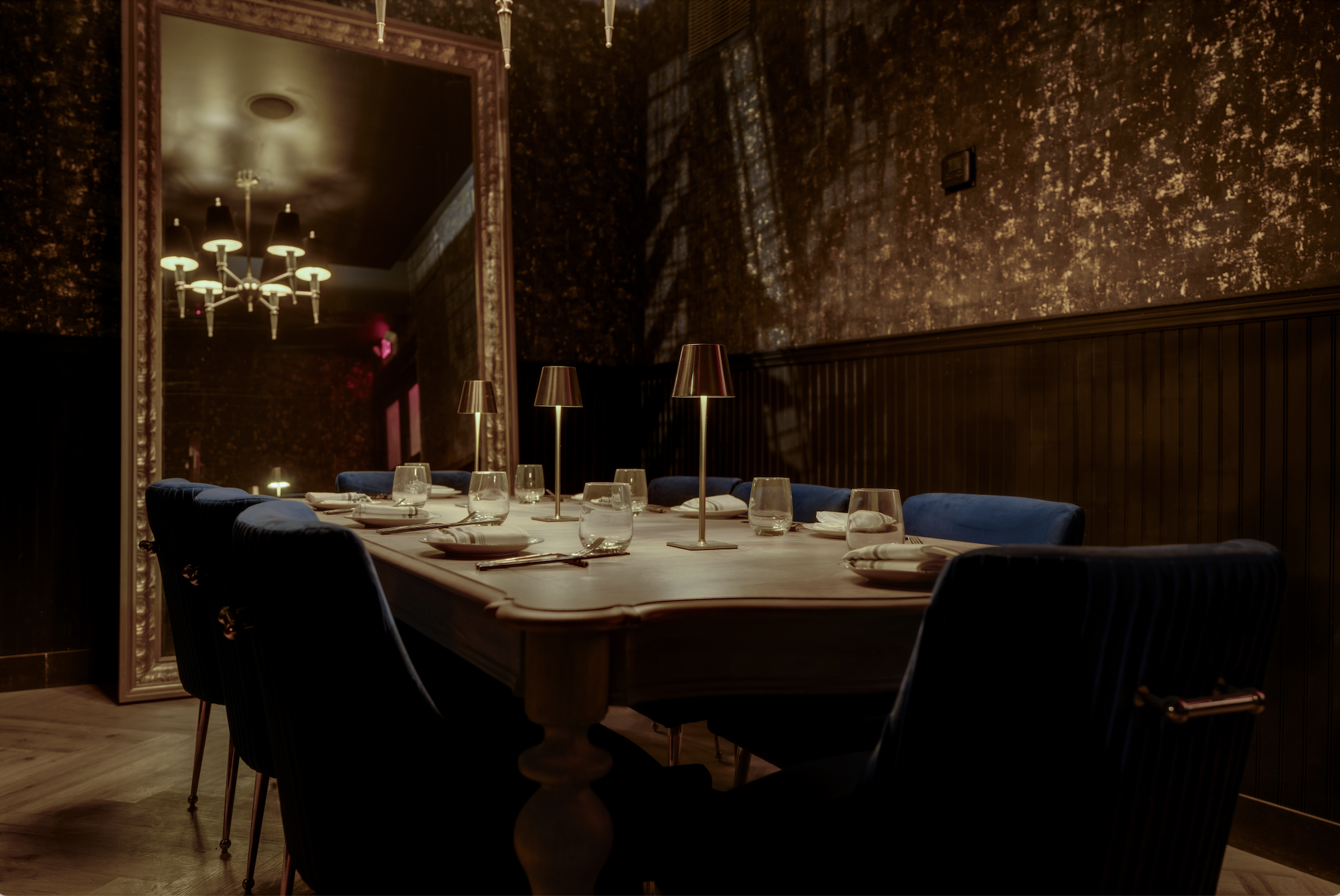 Salty Flame is made up of a 130-seat main dining room with luxurious velvet chairs, two private dining areas, and an outdoor wraparound terrace. The interior design features plenty of red and emerald velvet seating, gold accents, and ambient lighting to set the mood.