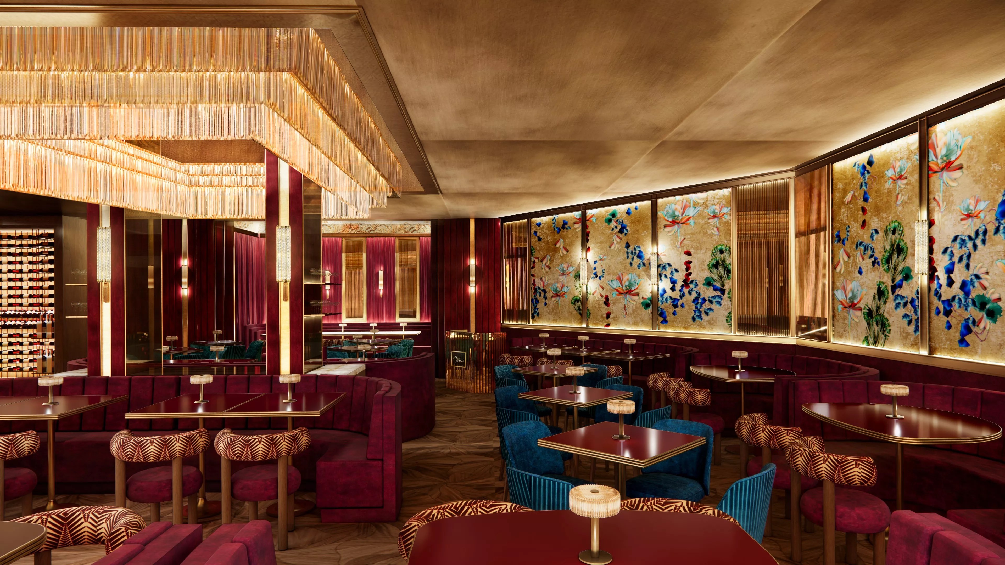 The new look builds on the brand’s red-and-turquoise palette and adds what the team calls “glamorous tropical luxe.” Guests will enter through a red-draped façade and a lacquered corridor lined with velvet walls and gold accents that leads to a reflective photo backdrop. Inside, deep red velvet banquettes, resin-topped tables, gold detailing, and a crystal chandelier anchor the dining room. A floral wallcovering by designer Candice Kaye will shimmer with metallic undertones throughout the space.