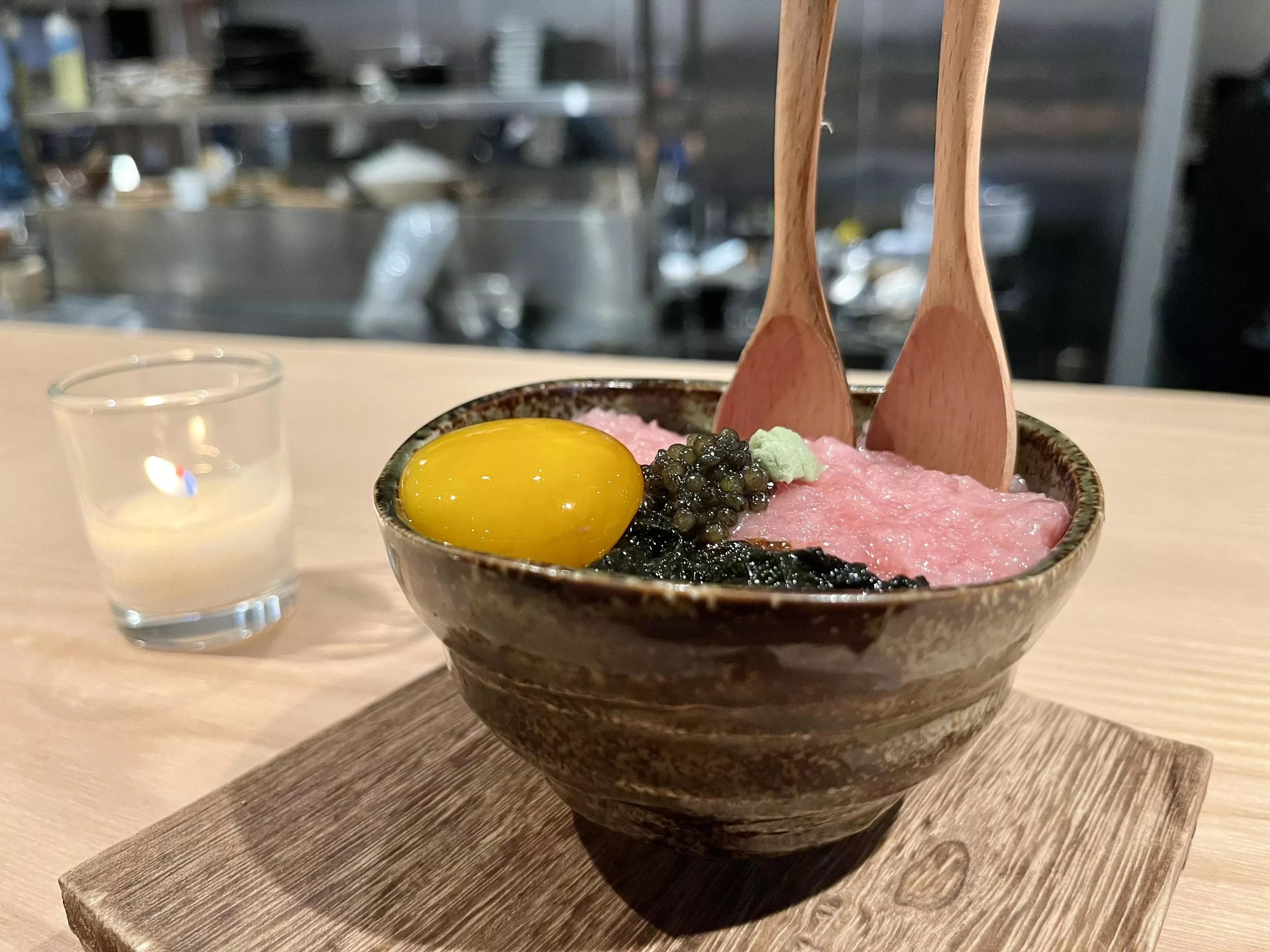 One standout menu item is the toro sundae, a decadent starter consisting of fatty tuna tartare, osetra caviar, marinated egg yolk, nori puree, and rice, served in a wooden bowl and meant to be eaten with a spoon.