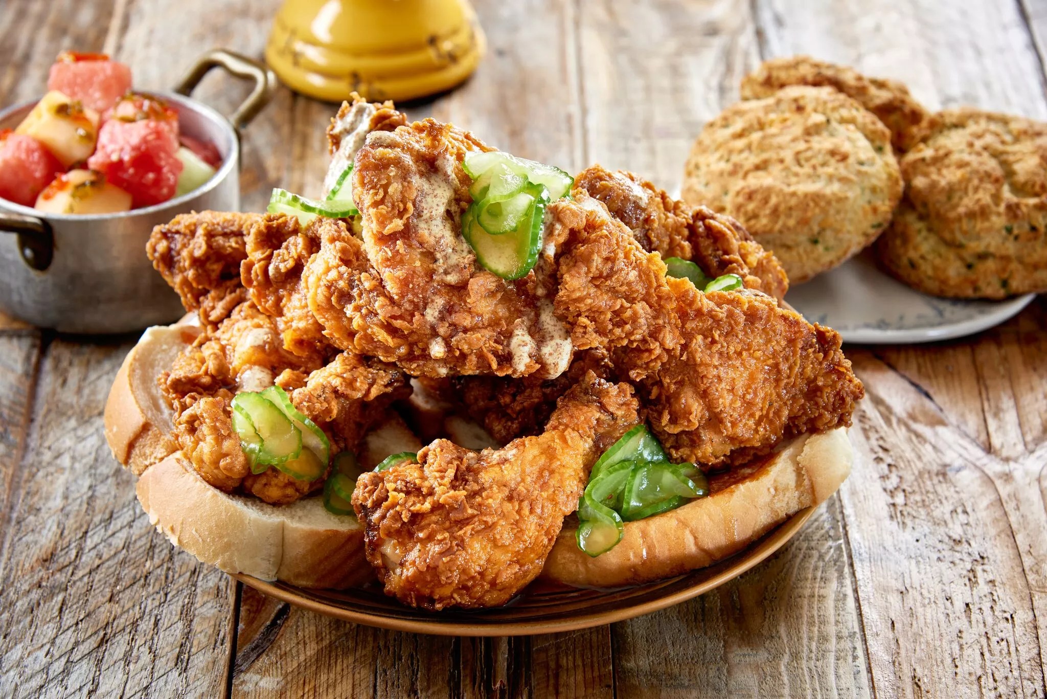 Each order ($48) includes six pieces of hot fried chicken with Florida cheddar-and-chive biscuits, enough to feed two or three people. The chicken is seasoned with a blend of cayenne pepper, hot paprika, ground mustard, and garlic and is garnished with Chinese hot mustard, local honey, and house-made pickle slices. There’s no cap on how many buckets a customer can order.