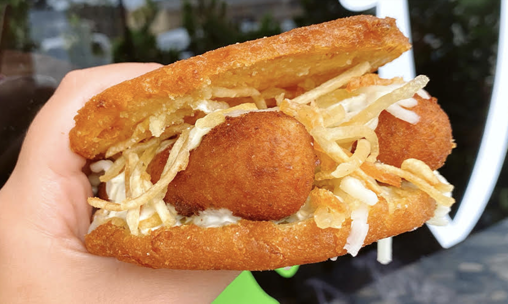 A close-up of a delicious croqueta sandwich with crispy shredded potatoes by Dos Croquetas