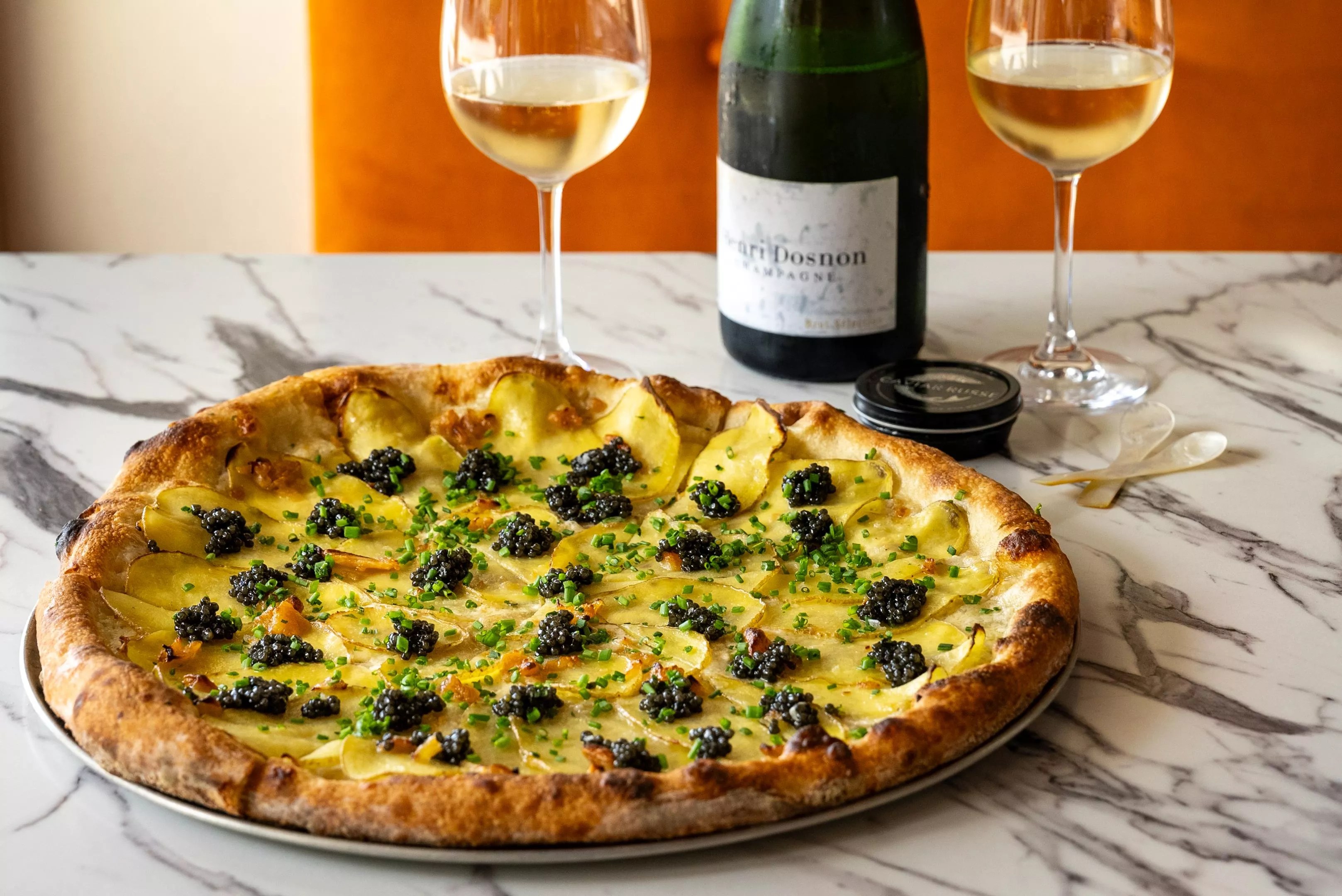 The limited-time caviar pizza will offered May 24 until June 30. It was inspired by the classic caviar service experience served at high-end restaurants, which pairs caviar, potatoes, crème fraîche, and scallions. At Eleventh Street Pizza, the pie is instead topped with sour cream and mozzarella for a creamy base. Then, they layer thinly sliced and slightly crisp potatoes over the pie in what the creators describe as a neutral canvas for the luxurious caviar topping.