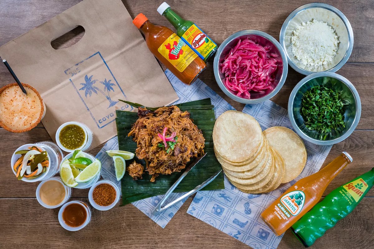 Coyo’s family pack feeds four to six and includes a choice of taco filling, two sauces, and two sides. Options include pollo al carbon, carne asada, and seared gulf shrimp ($25 to $34). No taco fiesta would be complete without margaritas, so snag a gallon of Coyo’s prebatched margaritas for $39.99. Delivery and takeout are available daily from 11 a.m. to midnight at all Miami-Dade locations.