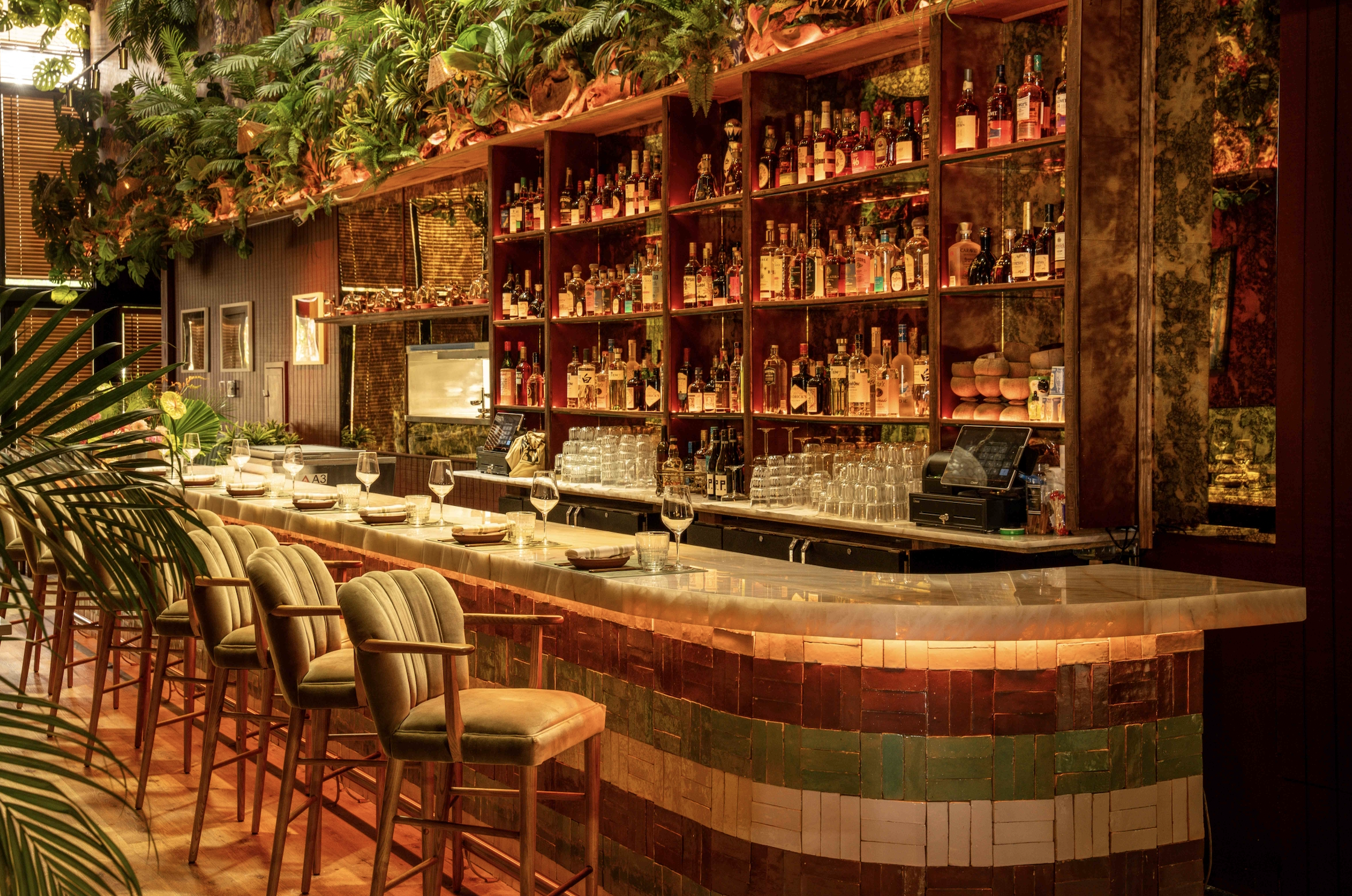 Inside, expect tufted velvet banquettes, rich plum walls, and the brand’s signature wallpaper. Outside, guests can grab a drink along the 50-seat canal-side patio or head upstairs to a vibrant rooftop jungle bar.