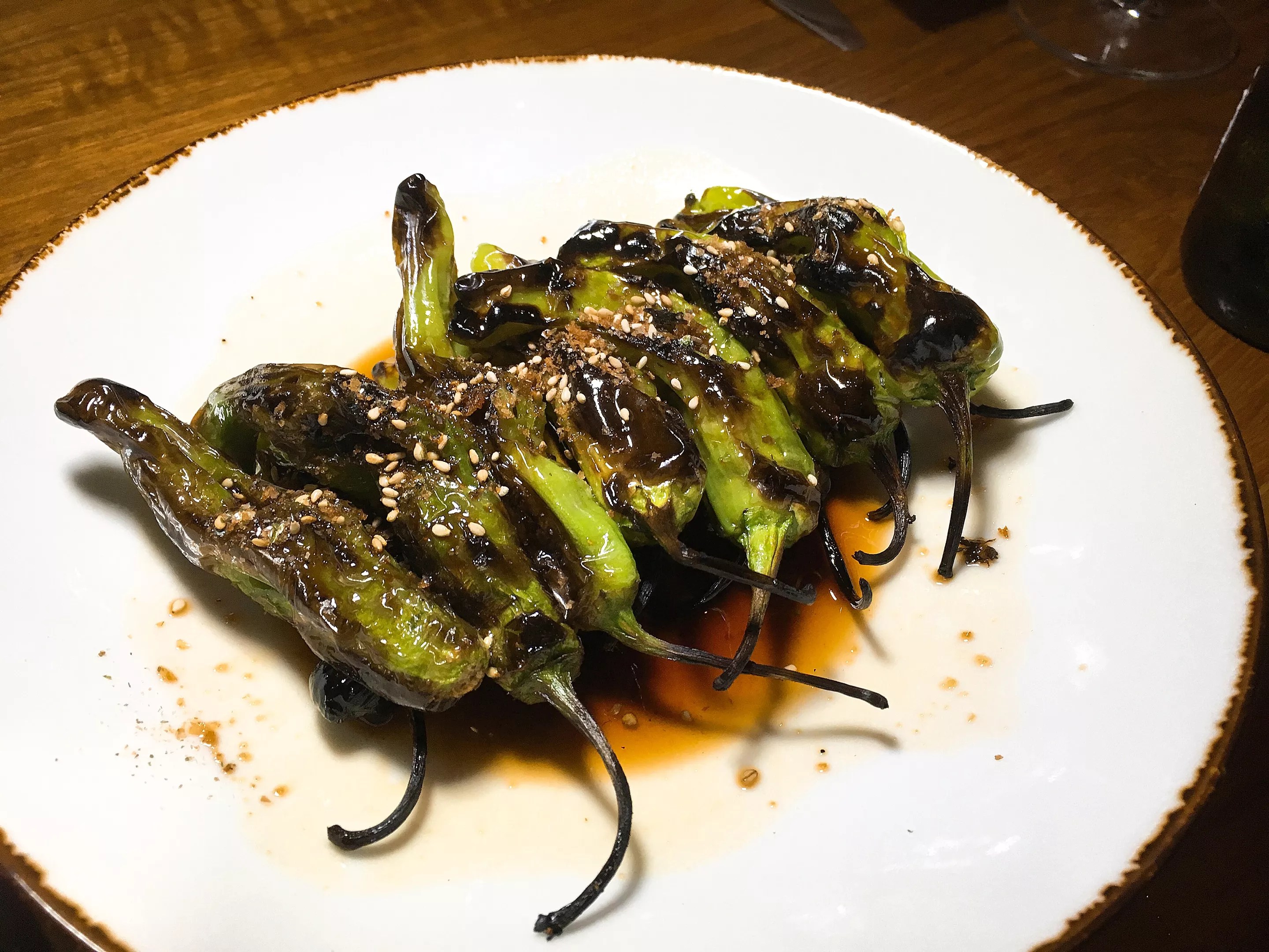 Grilled shishito peppers, served only on the lunch menu, are charred with citrus ponzu and Japanese spices. The East Asian green peppers are known to be sweet, but one of every ten is very spicy, with one guest at the table lucky enough to bite into one of these potent peppers – and tearing up in the process. Photo by Lyssa Goldberg