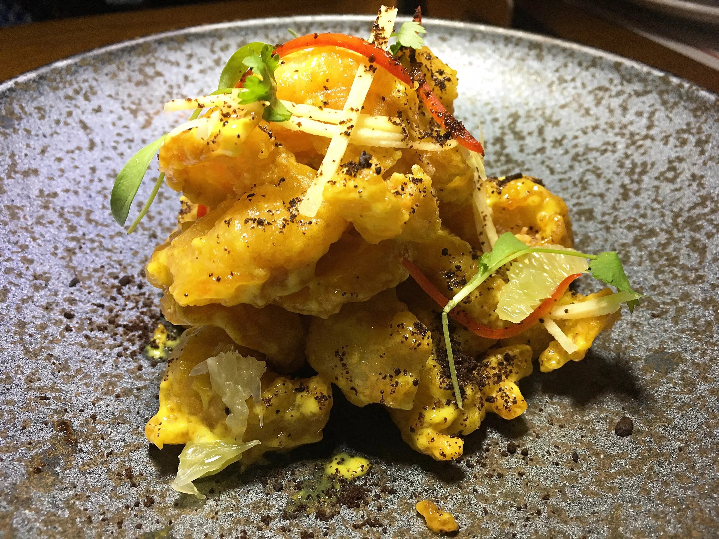 Battered curried shrimp offer a soft ginger, lime, and cilantro zing and are topped with black bean powder as a delightfully salty accent. One of the most expensive starters on the regular menu at $26, the curried shrimp starter ensures your Spice dinner is a good value. Photo by Lyssa Goldberg