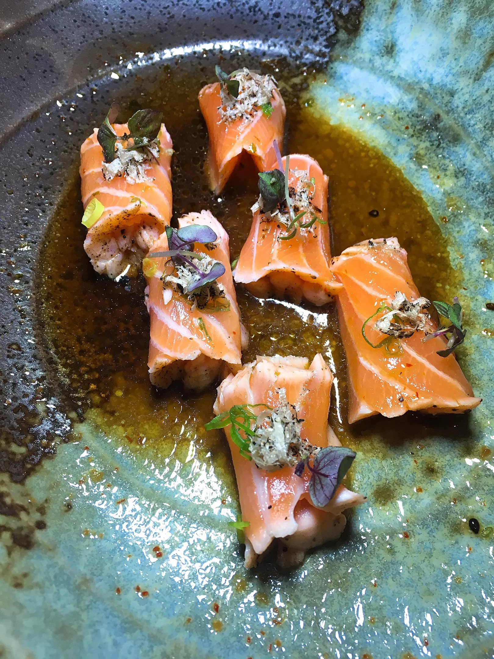 Worth the $6 up-charge, the salmon truffle honey rolls with shaved truffle and shiso leaves offer a delicate balance of a fresh, mild fish flavor and sweet honey sauce. This dish was easily one of the table favorites. Photo by Lyssa Goldberg