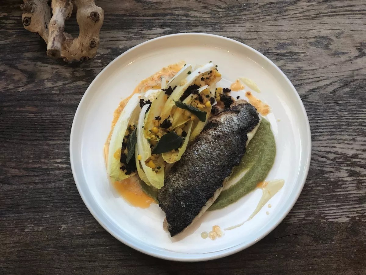 As for entrées, carnivores can go for the Creekstone Farms flat-iron steak served with grilled squash, green olive and rosemary salsa verde, and blistered baby tomatoes or a Berkshire pork chop served with heirloom carrots, watercress, carrot dill yogurt, and date and black pepper molasses. Though Edge is a steakhouse, vegetarians are not forgotten: The ricotta and lemon ravioli — served with mushrooms roasted with chili and garlic, golden raisins, and dandelion pesto — is made with them in mind. There’s also a branzino served with green romesco sauce, endive and sweet corn salad, ‘nduja (spicy spreadable pork salumi), and sage.