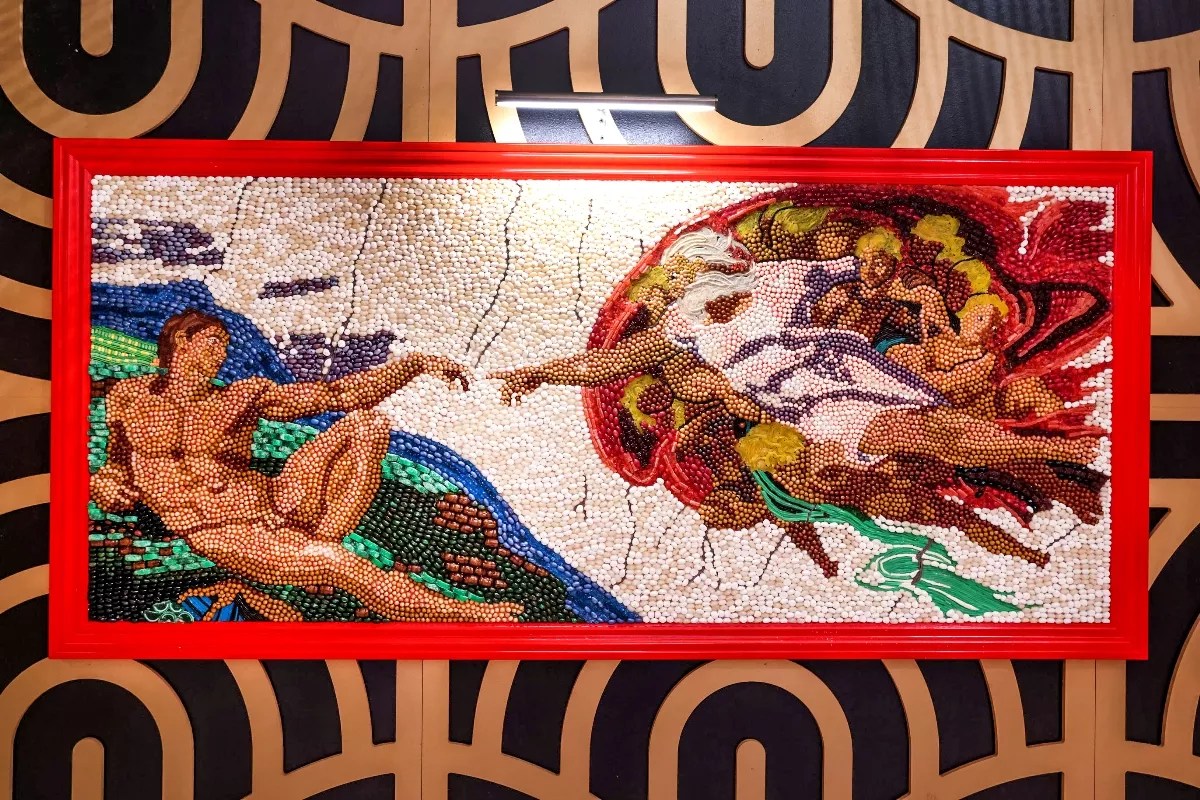 But look slightly closer and you’ll discover that each piece took hours to complete by hand. A life-size llama, for instance, is made from 8,700 pieces of candy and took 158 man-hours to complete, while a re-creation of Frida Kahlo’s famous self-portrait required just over 3,000 pieces of candy and took 255 hours to finish.