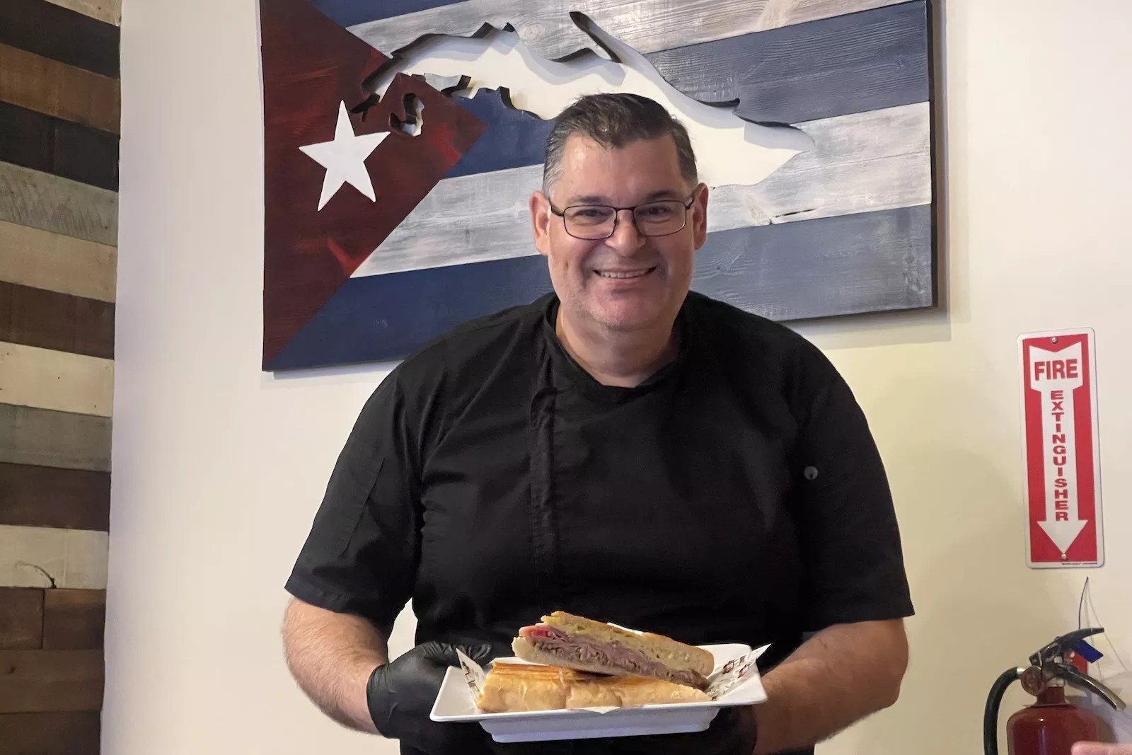 Ramses Garcia of Las Palmas Latin Grill holds a plate of the restaurant’s legendary Tampa-style Cuban sandwiches.