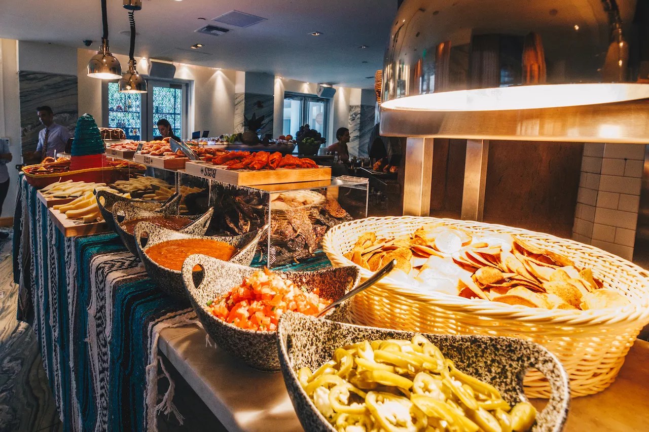 Inside the Shore Club, chef Jose Acardi hosts a Sunday brunch “a la Mexicana,” priced at $35. The buffet-style meal offers seven food stations, a raw bar, tableside guacamole, and a taco cart. Must-try items are the mushroom and cheese empanadas, salmon tartare, chicken mole, chilaquiles, and Mexican rice with cilantro. At the dessert table, find tres leches, cakes, and tartlets. Bottomless bubbly flows for an additional $25. Brunch is served Sunday from 11:30 a.m to 4 p.m.