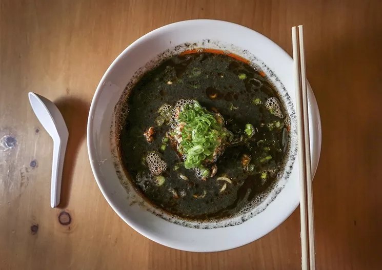 2. Estrella pasta at Upland. Of all the dishes at Justin Smillie and Stephen Starr’s South of Fifth haunt, the one rife with creamy chicken liver is most shocking. The house-made estrella pasta ($21) builds on long tubes of extruded dough boasting a star-shaped cross section, hence the name. The toothsome noodles are cut to a manageable size and tossed in a simple sauce of chicken livers enriched with sherry, rosemary, and sage. 49 Collins Ave., Miami Beach; 305-602-9998; uplandmiami.com. Spicy black miso ramen Photo by CandaceWest.com