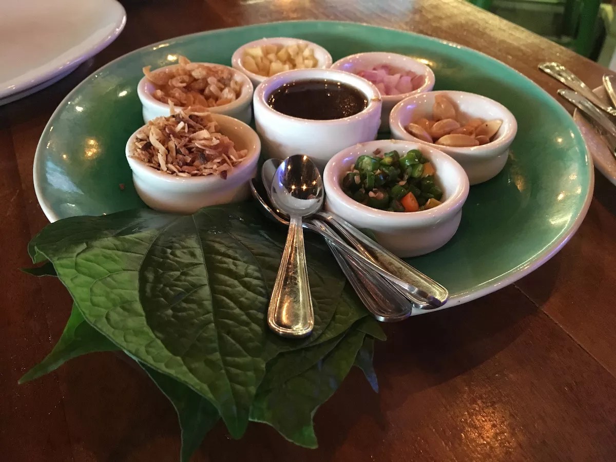 3. Spicy black miso ramen at K Ramen. Burger. Beer. Miami has a serviceable selection of ramen. Yet most choices involve the thick, sticky pork-bone broth tonkotsu, which is produced by running boilers for hours on end. Thus, much of the ramen comes at a hefty price. Now enter K Ramen’s spicy black miso. It starts with chicken carcasses that are boiled with kombu, leeks, shiitake mushrooms, bonito flakes, and other aromatics to create a fragrant, delicate broth that by itself would suffice as the base for a fine chicken soup. Next comes a heroic dose of salty black miso that turns the brew an evil ebony. A dose of chilies and cracked sesame seeds lends an alluring spice and a nutty flavor that pairs smartly with the miso and clings to thin, chewy noodles that diners can slurp until 2 a.m., all for a mere $14. 150 20th St., Miami Beach; 305-534-7895; sbe.com/restaurants/locations/k-ramen-burger-beer-south-beach. Atchana’s miang kham has all the elements of the perfect bite. Photo by Zachary Fagenson