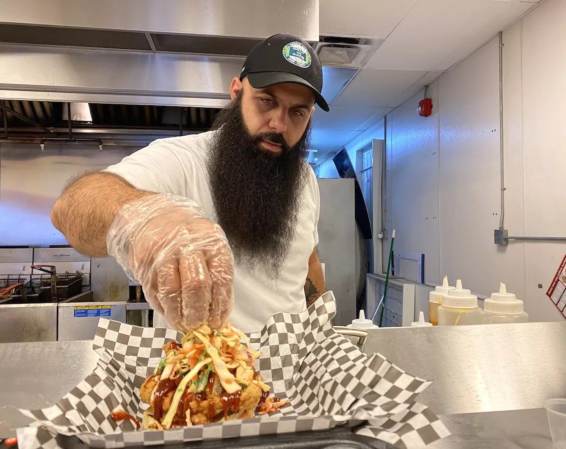 Frankie Zerquera puts the finishing touches on the Baddest BBQ Chicken (): Fried chicken topped with slaw, pickles, and house barbecue sauce.