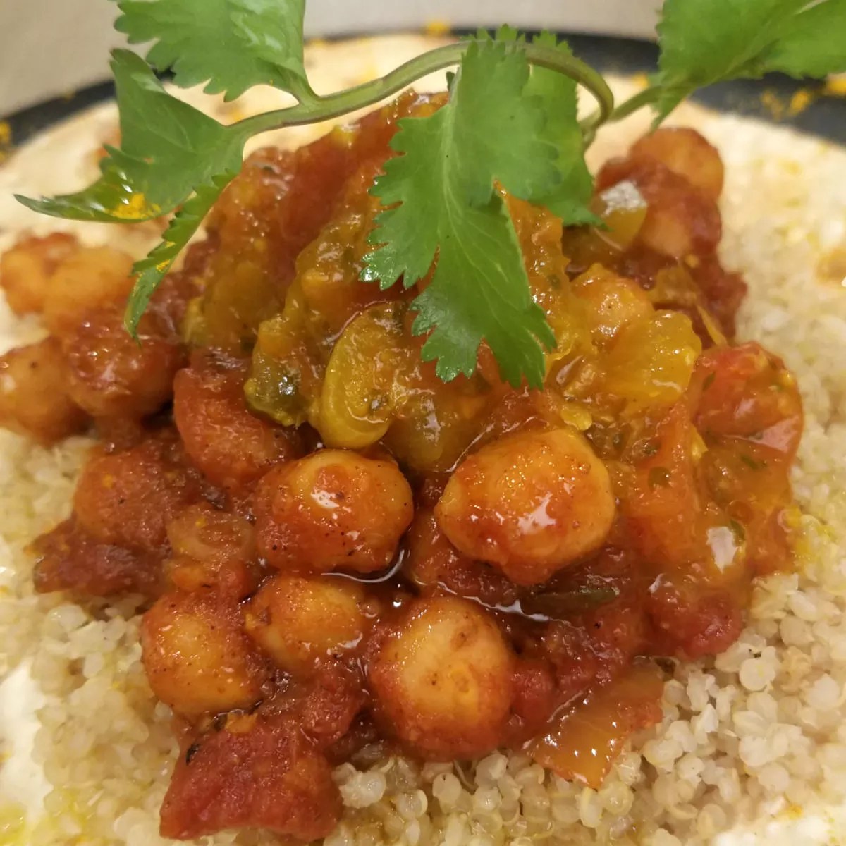 A sweet and spicy chana masala ($12) is a flavorful mix of chickpeas, garam masala, mango, tomato chutney, and quinoa, all atop a crisp papadum.