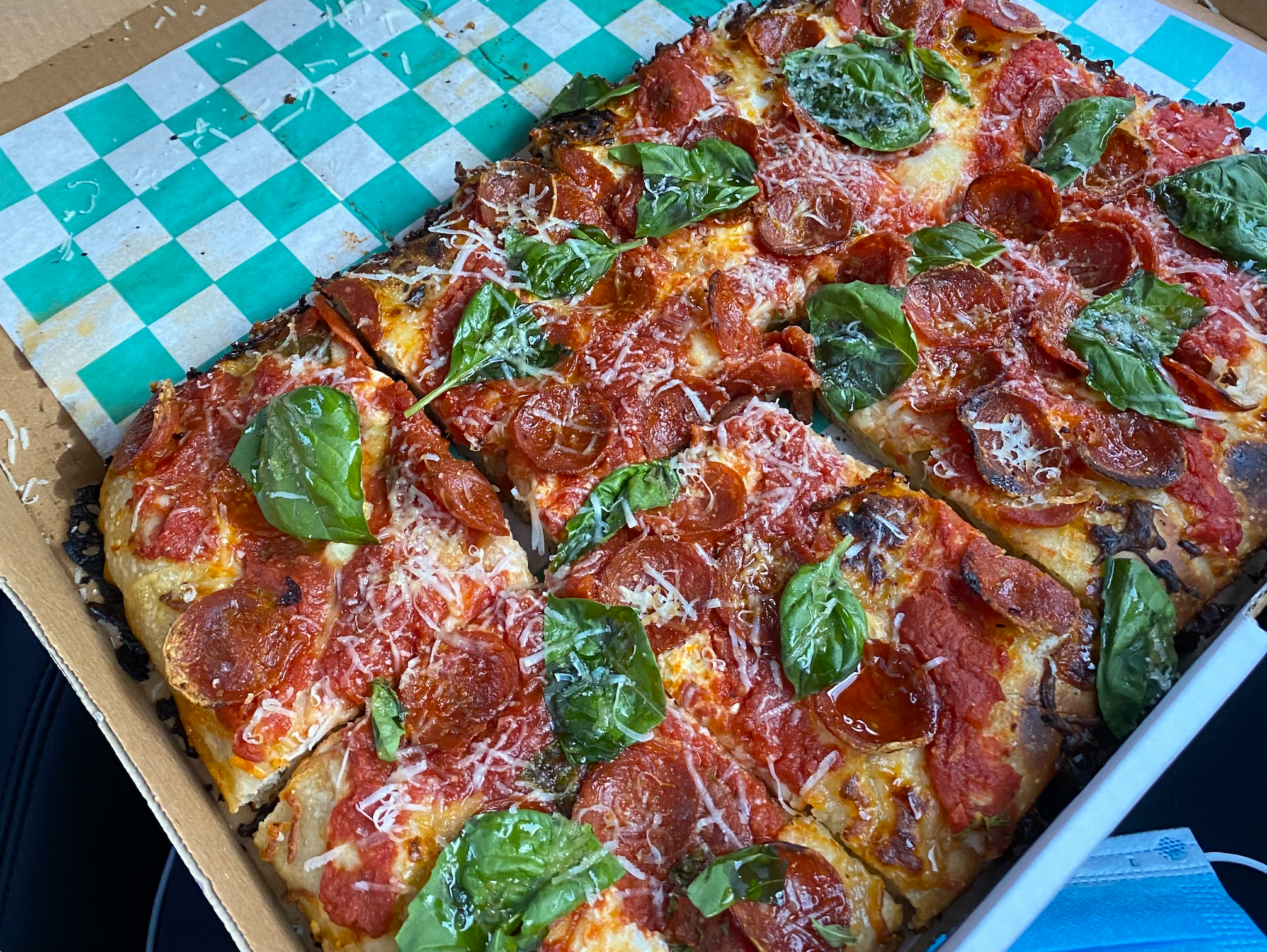 Old Greg’s Pizza’s “O.G. Roni” pie sits on my lap on April 25, 2020, in Miami, during the COVID-19 pandemic. A mask is seen in the bottom right corner.