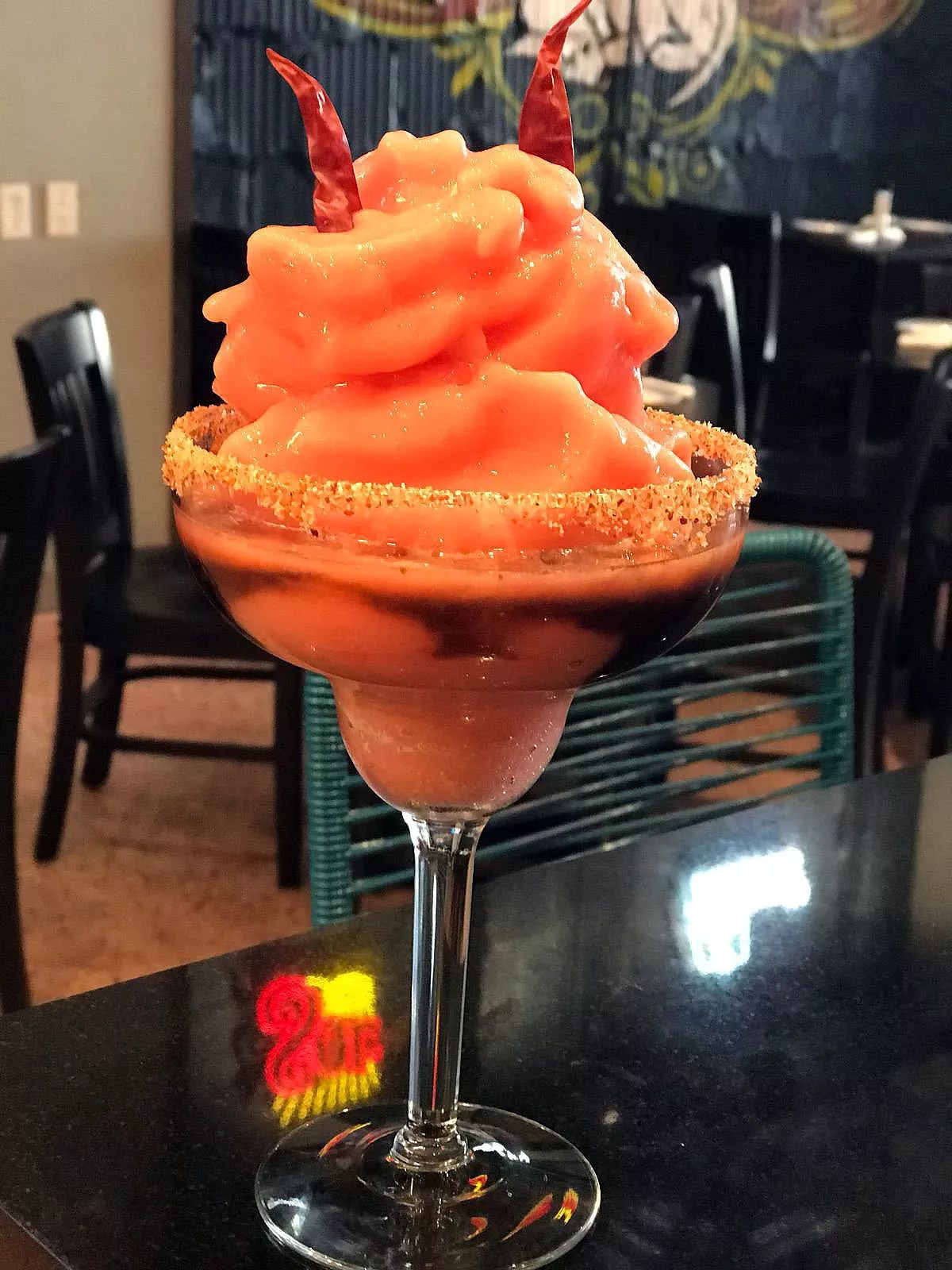 2. Diablo Margarita at La Cerveceria de Barrio. This nefarious margarita is a mélange of both spicy and sweet flavors. Melting beneath two chili horns, the creamy strawberry purée melds with Lollipop Brew Courtesy of Sugar Factory