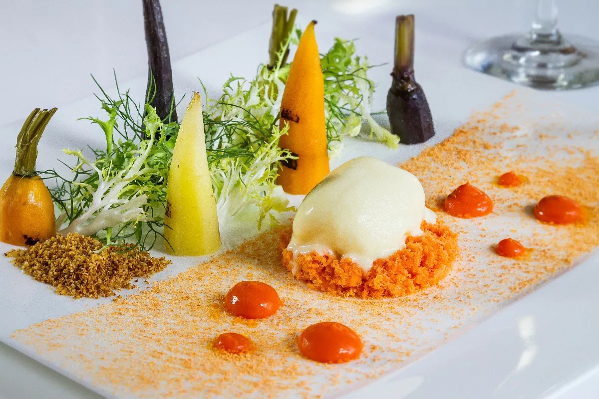 9. Unicorn at Pao by Paul Qui. Although the $6 million golden unicorn statue at the center of the dining room continues to wow patrons at the Faena Hotel’s Pao by Paul Qui, there’s even more rejoicing when they see Chef Qui’s other “unicorn” among dishes inspired by his native Philippines. An ode to the ornate sculpture, a spiky sea urchin shell is filled with a frothy grilled sweet corn pudding, sake aioli, chile de arbol, lime, and sea urchin for $29. 3201 Collins Ave., Miami Beach; 786-655-5630; faena.com. Heirloom carrots at Canvas at the Sagamore Hotel. Courtesy of Canvas