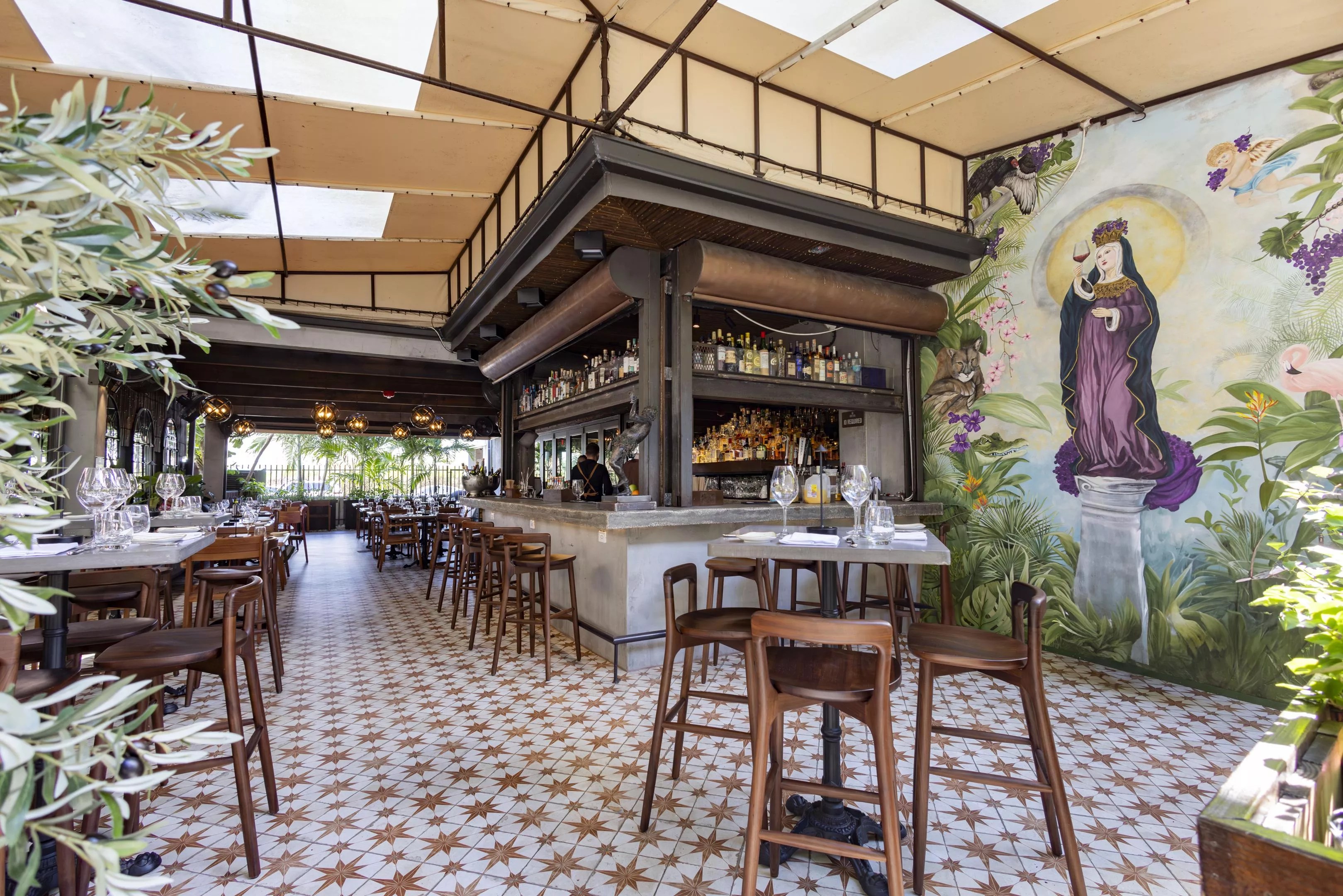 A highlight of the decoration includes the mural painted by Ana Cufre of the Virgin of Carrodilla, also known as the “Wine Virgin.” The image is traditionally depicted in vineyards, but to bring a Miami vibe, the artist chose to include lush plants and elegant flamingos.